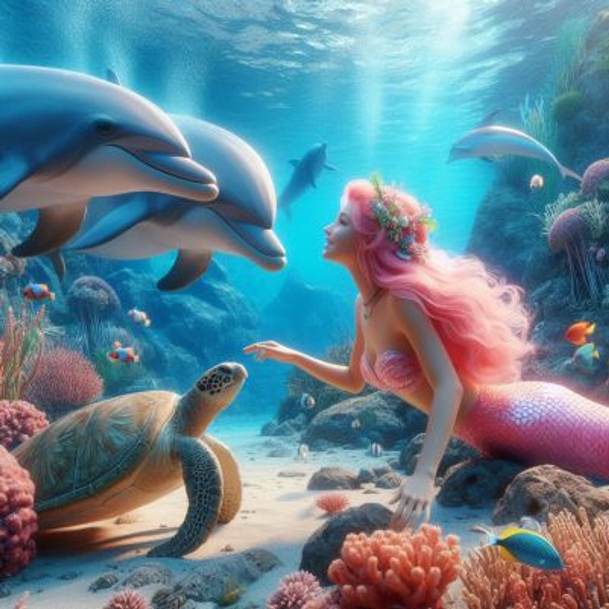 Pink mermaid, dolphins and turtle