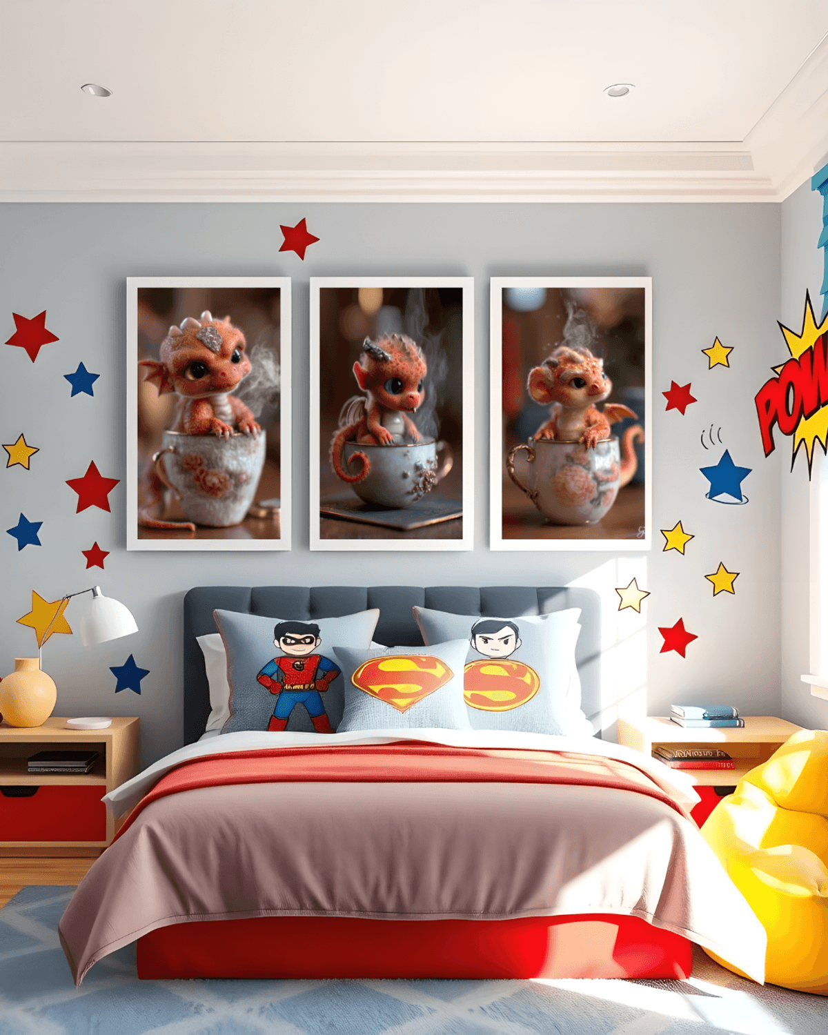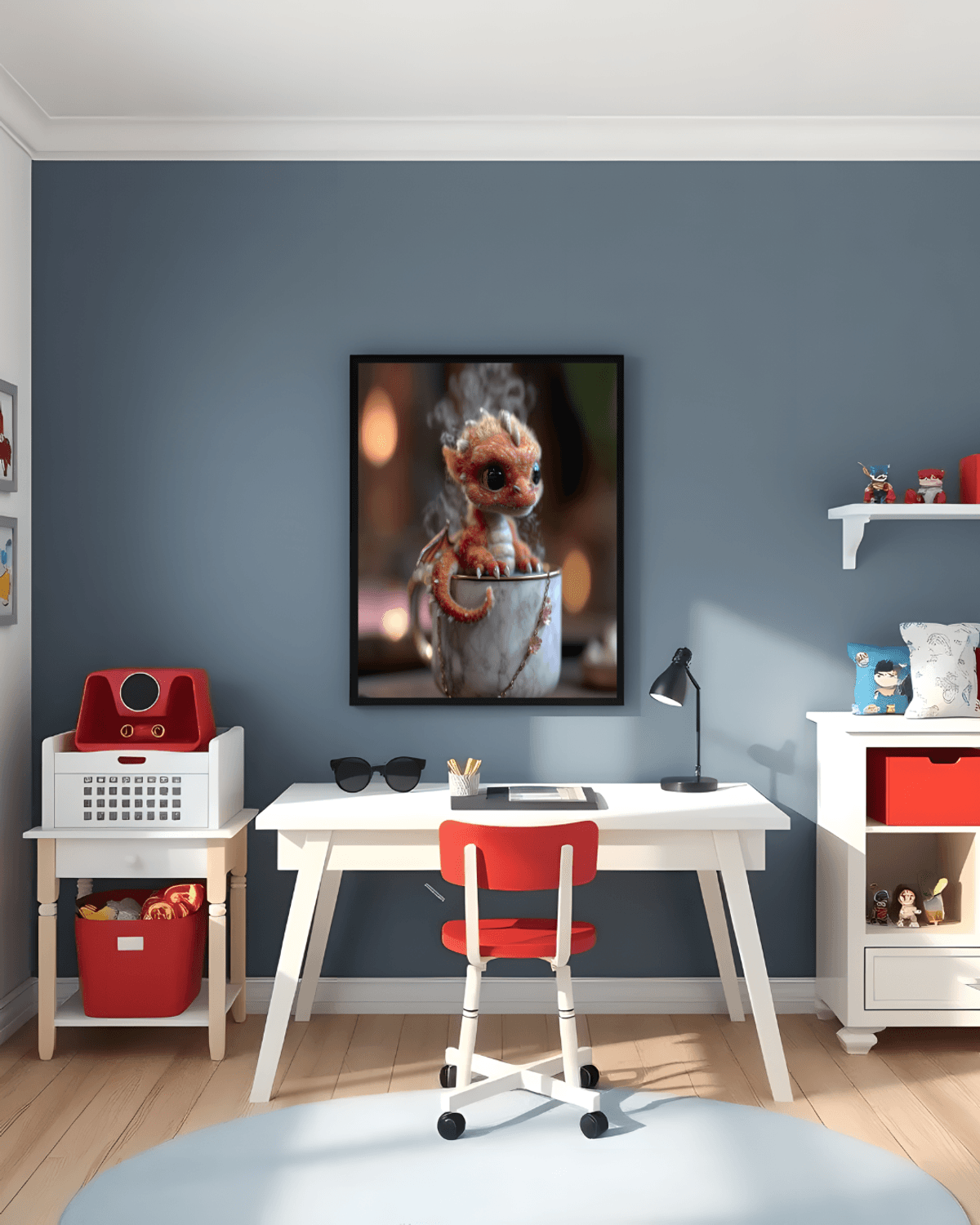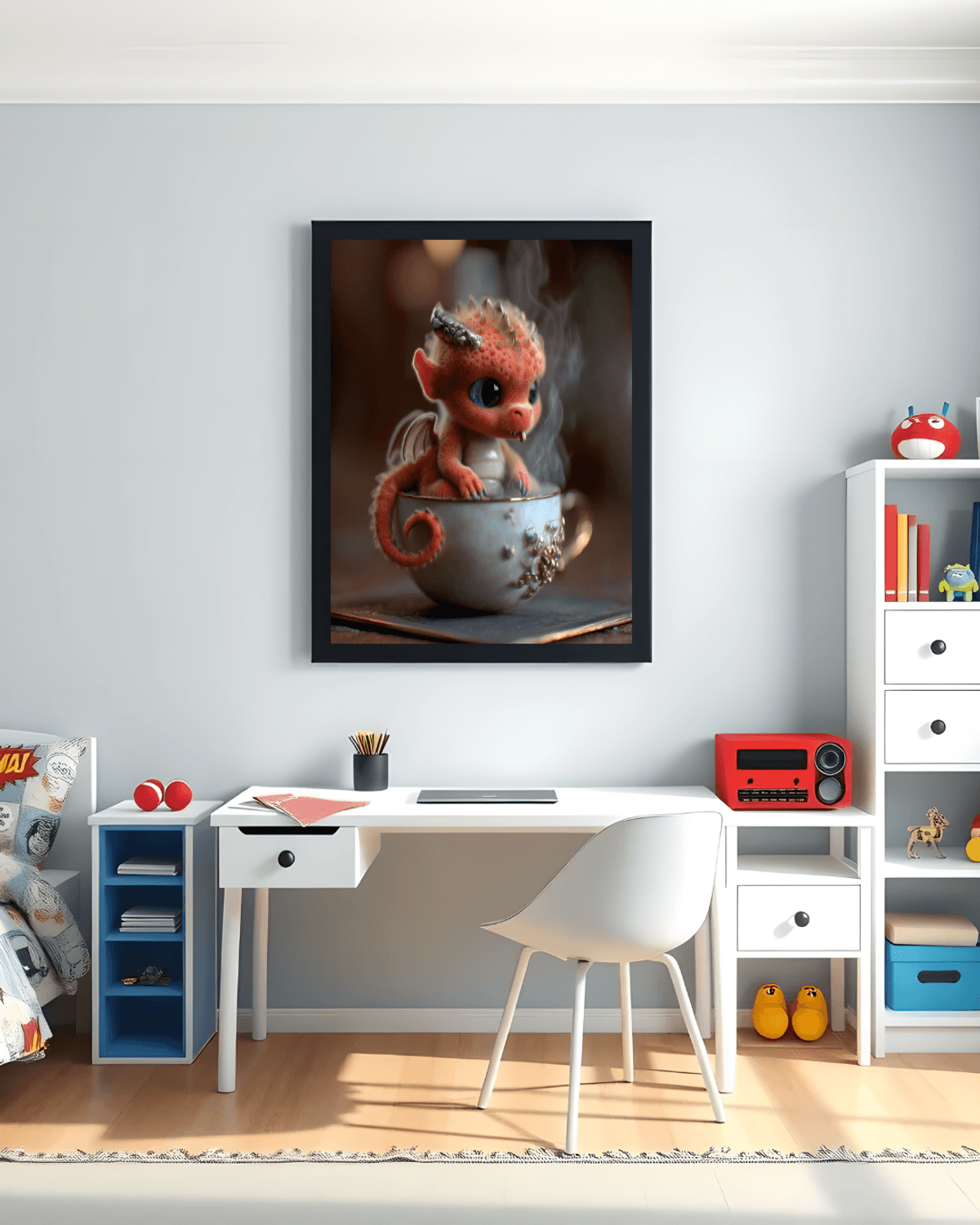 Teacup Dragon Fantasy Art Print – Fiery Orange Baby Dragon in Porcelain Cup, Cute Magical Creature Wall Decor