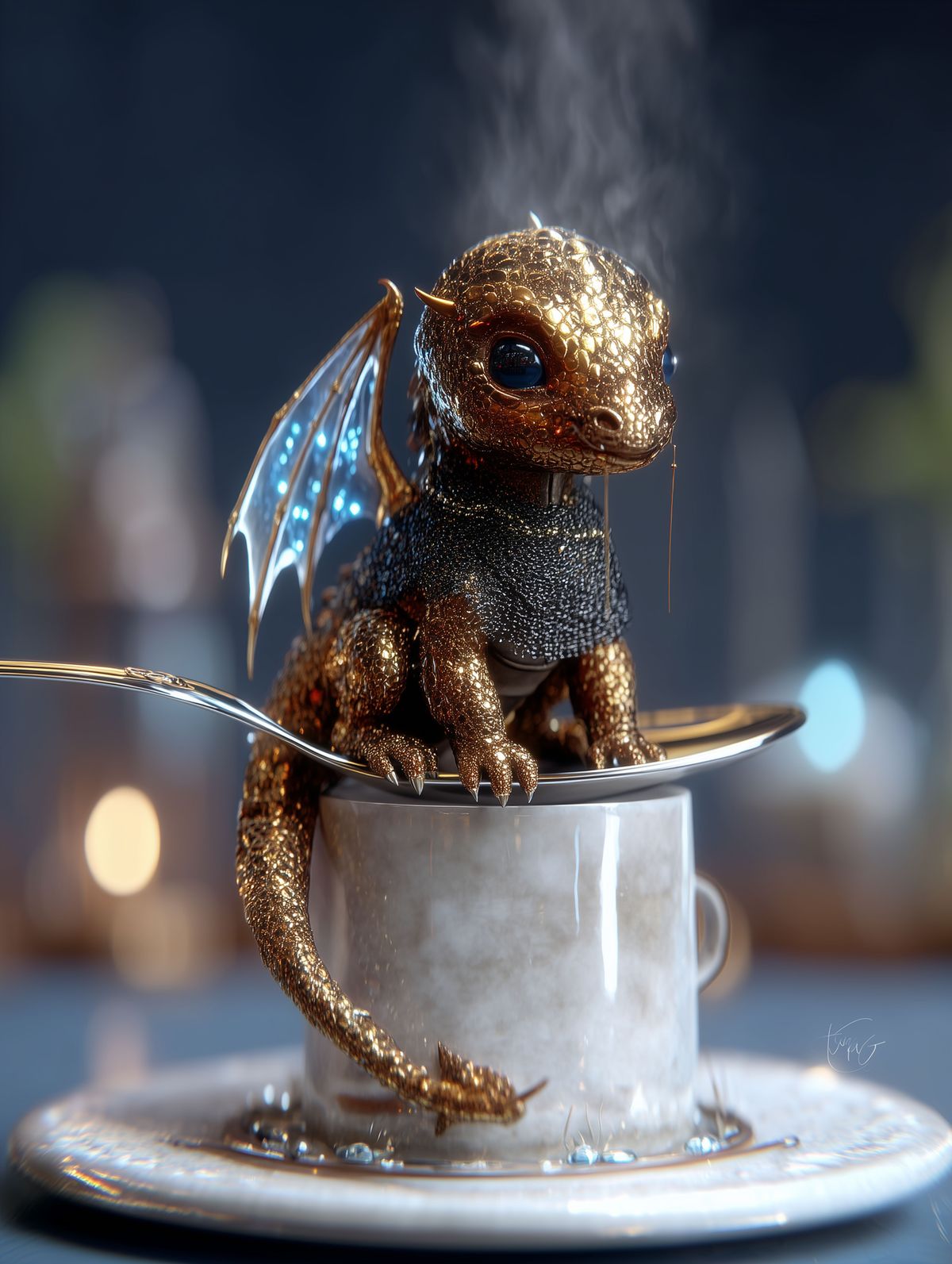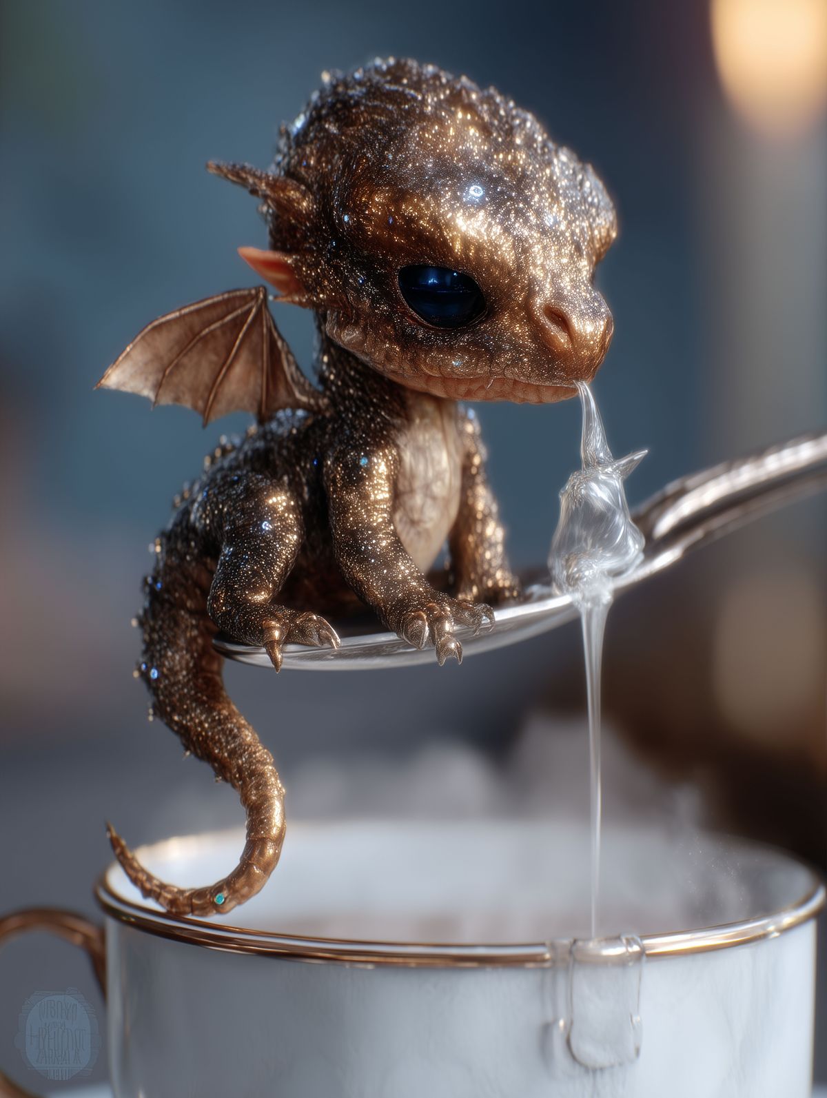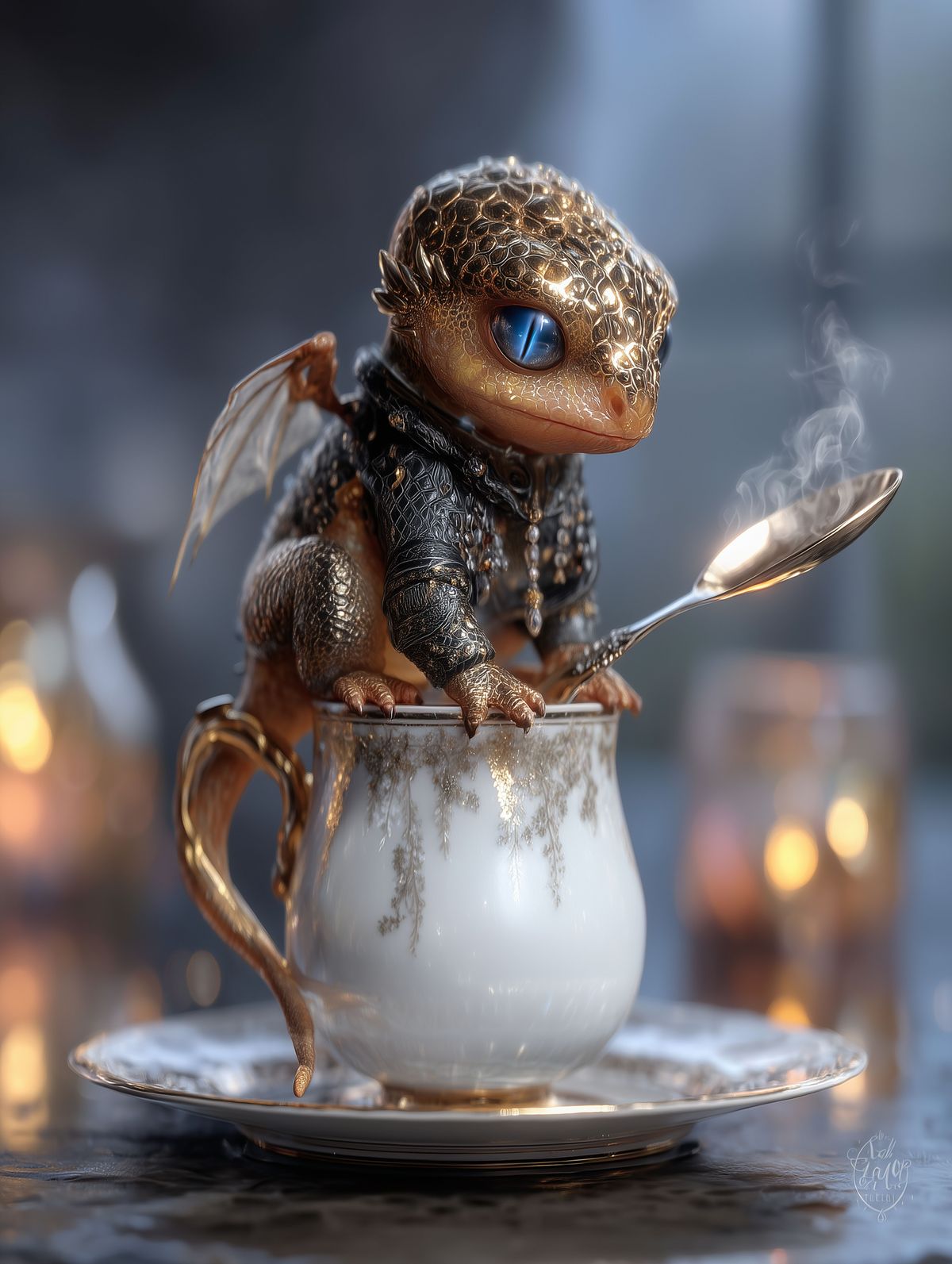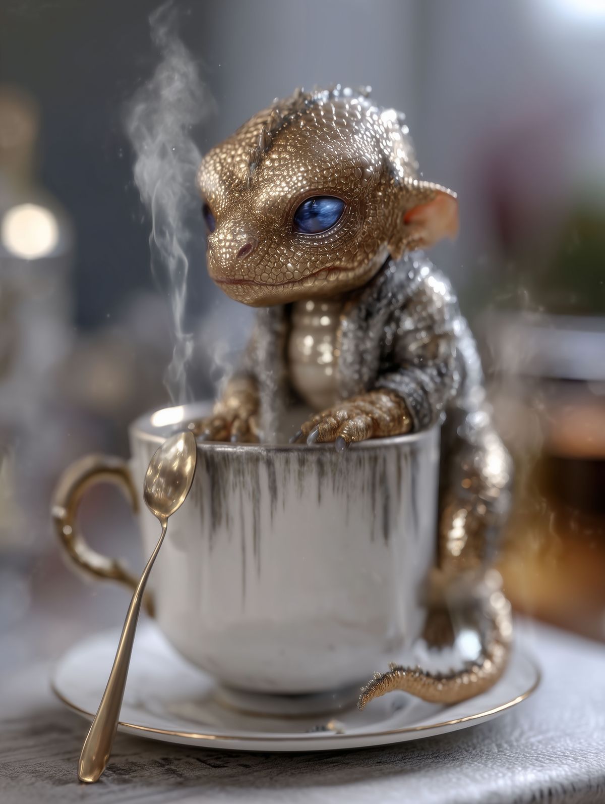 Golden Baby Dragon Teacup Print – Regal Fantasy Art with Silver Spoon & Blue Eyes, Cute Dragon Decor Gift
