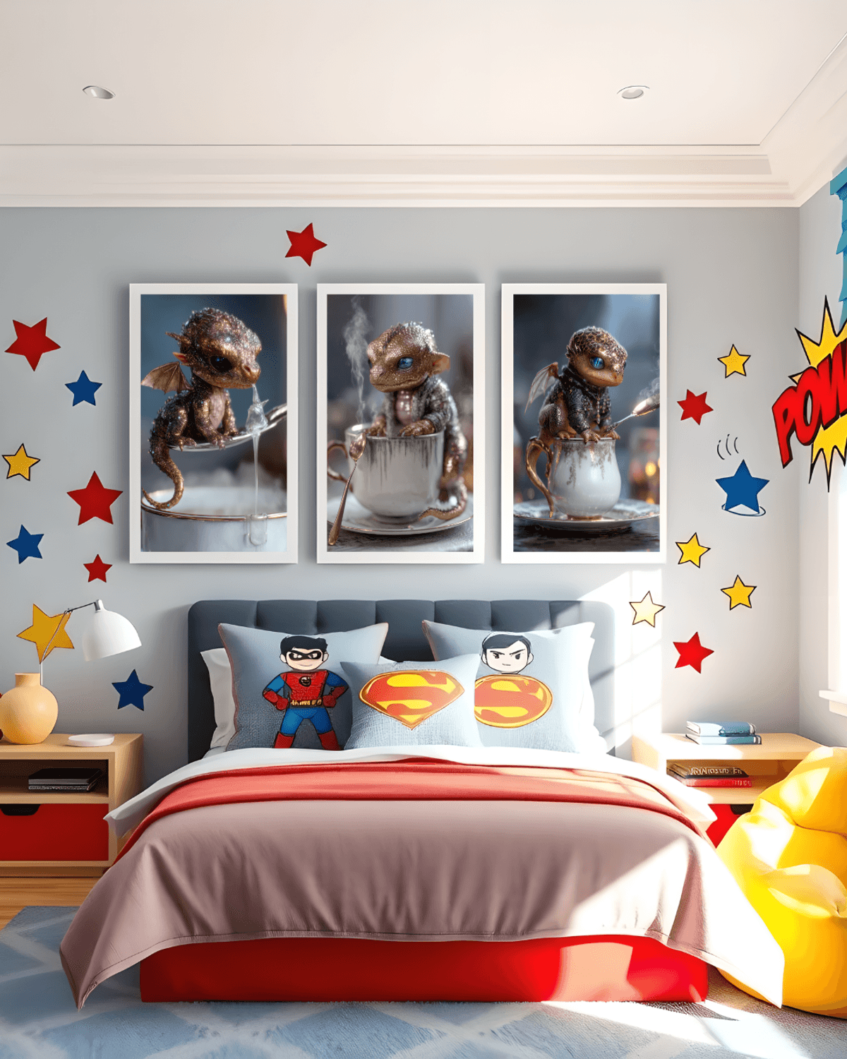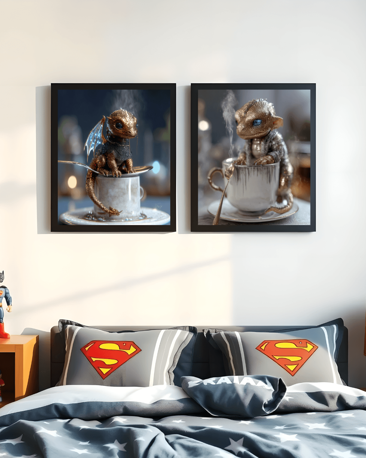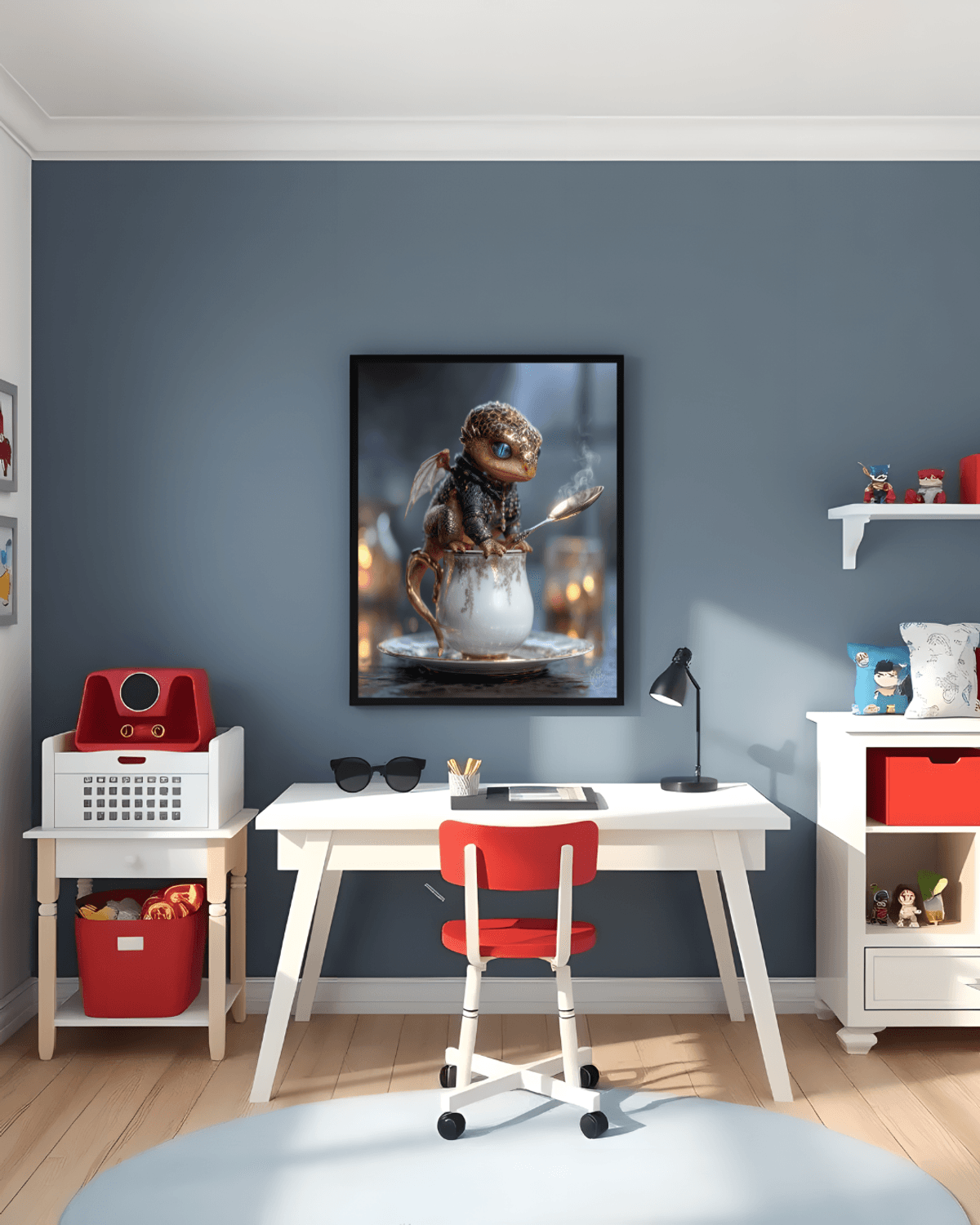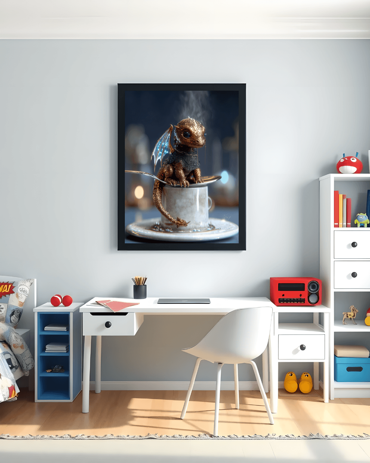 Golden Baby Dragon Teacup Print – Regal Fantasy Art with Silver Spoon & Blue Eyes, Cute Dragon Decor Gift