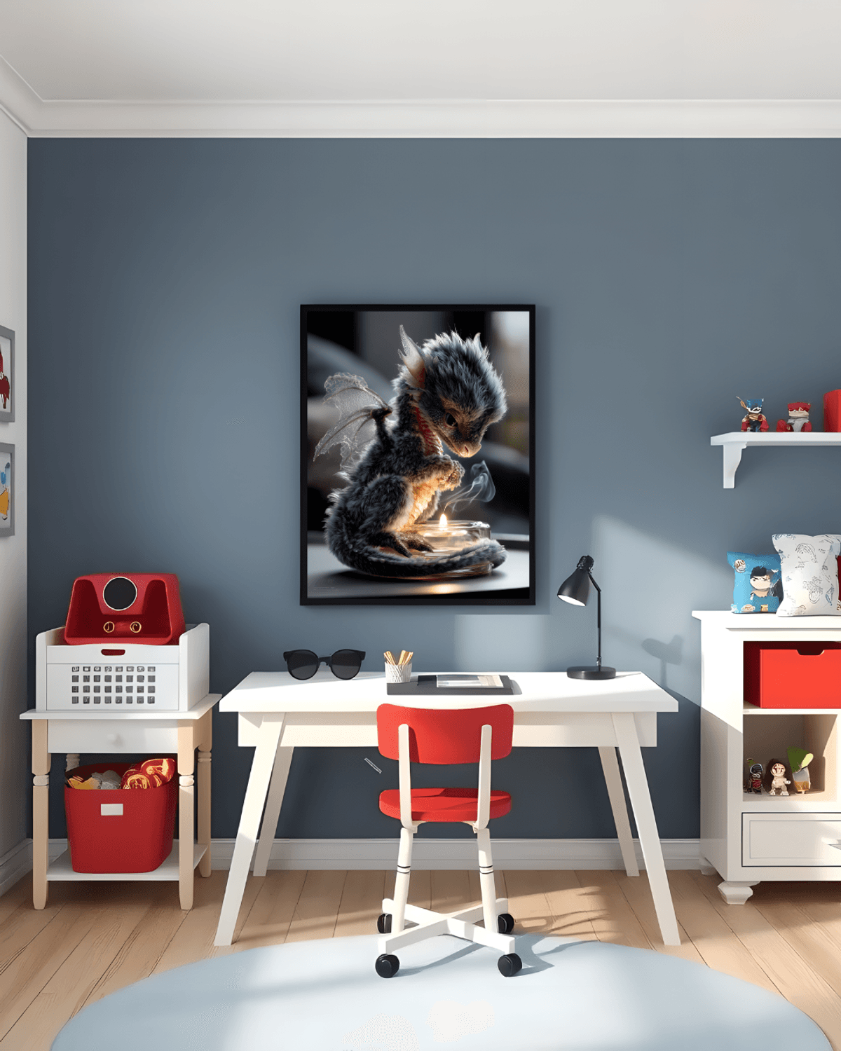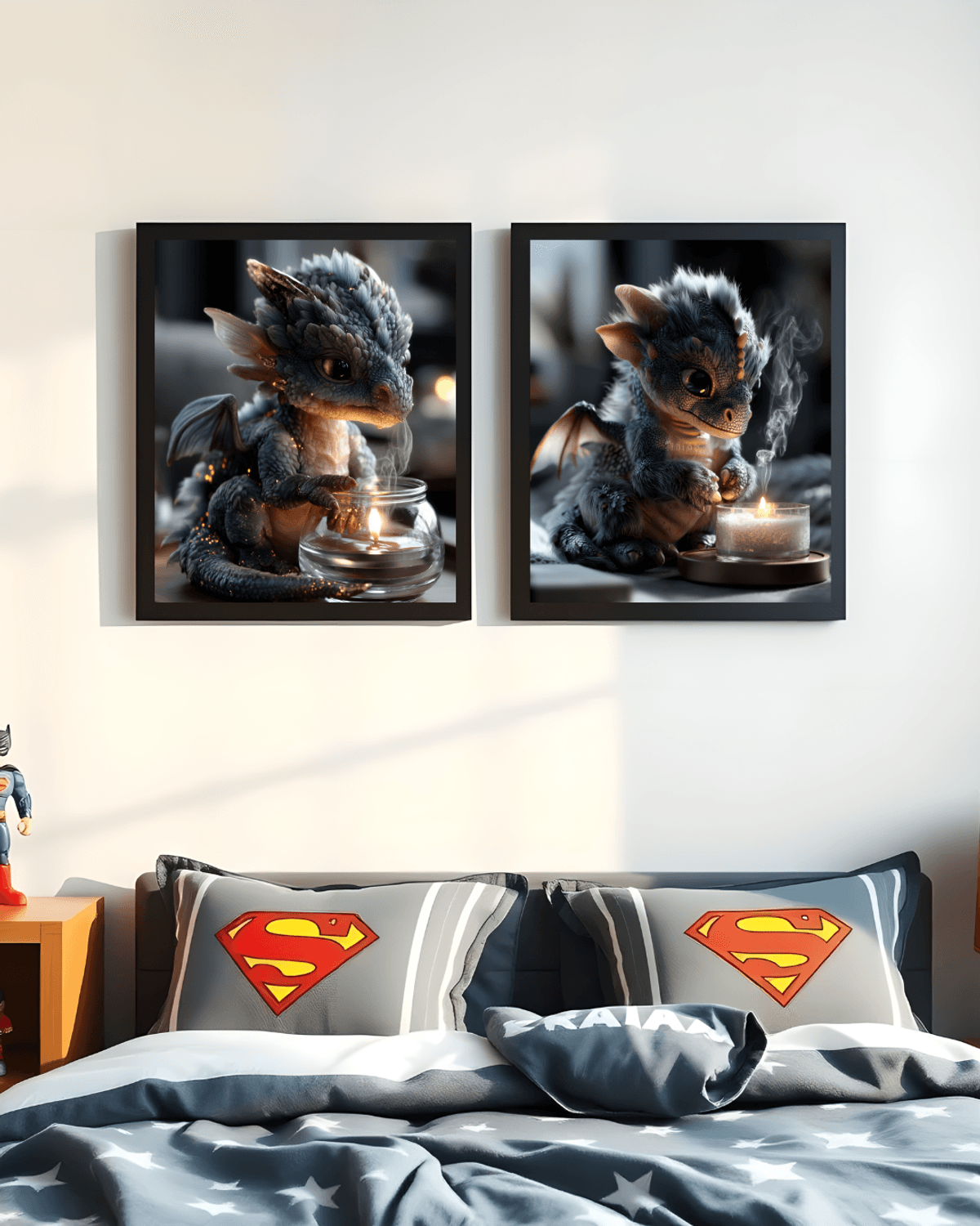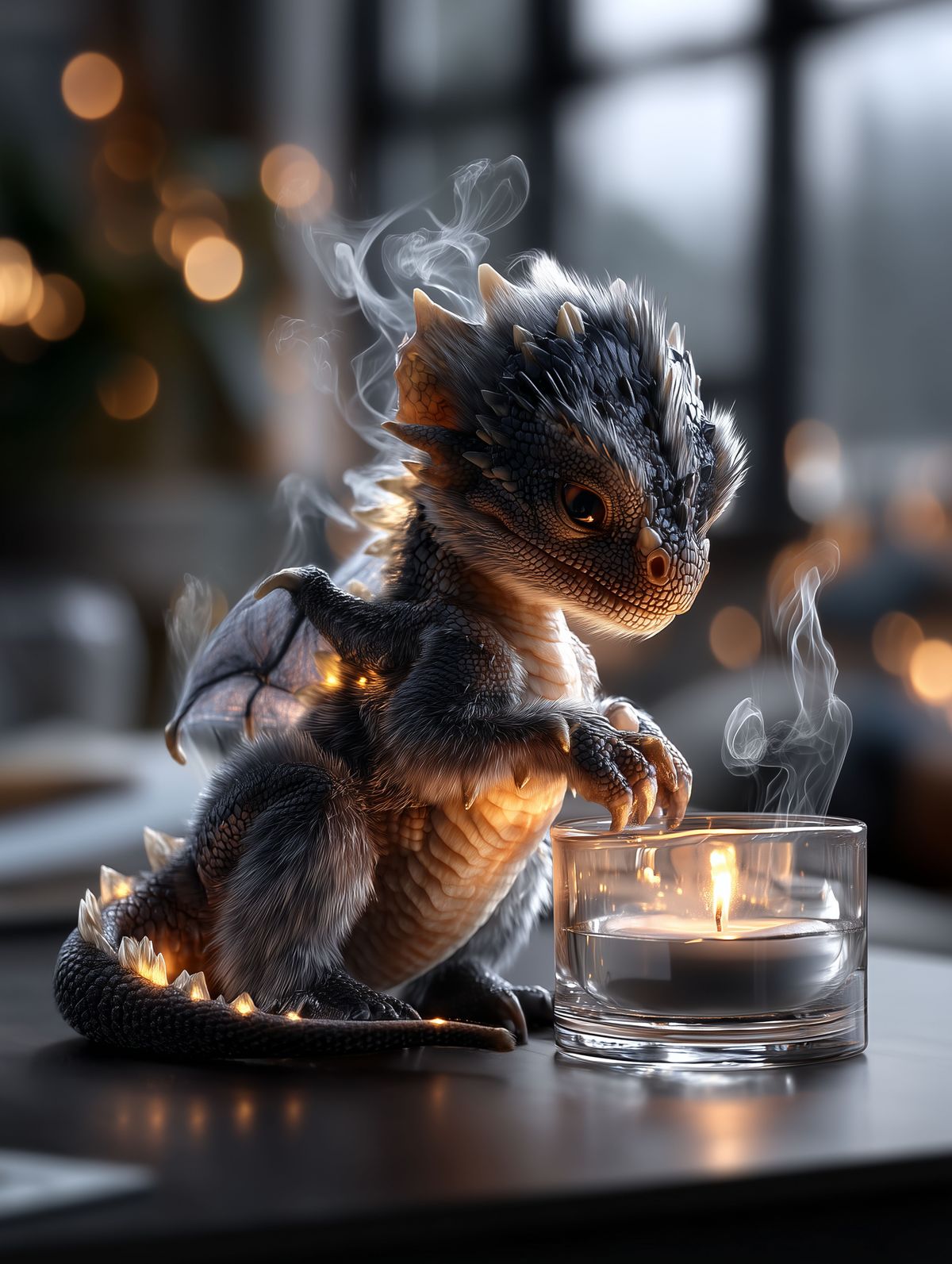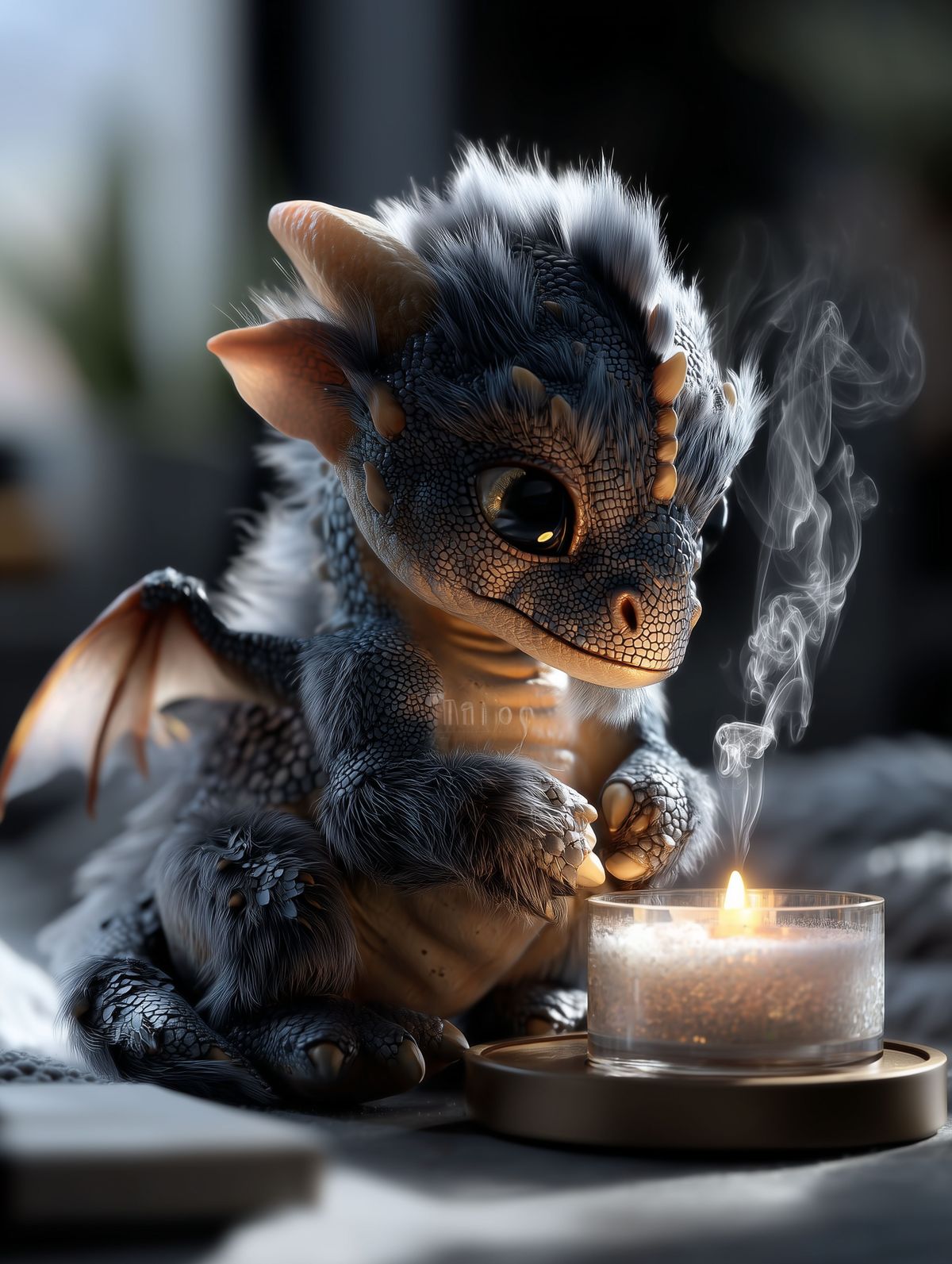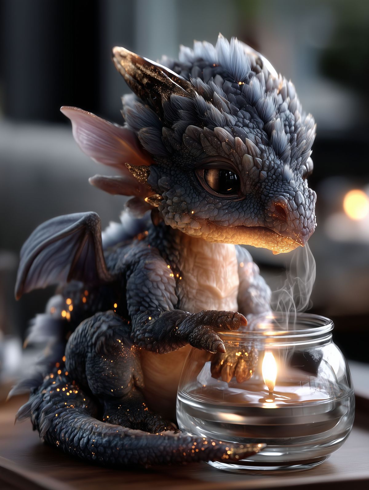 Storm Grey Baby Dragon Art Print – Candlelight Fantasy Creature, Cozy Nursery & Magical Gift Decor