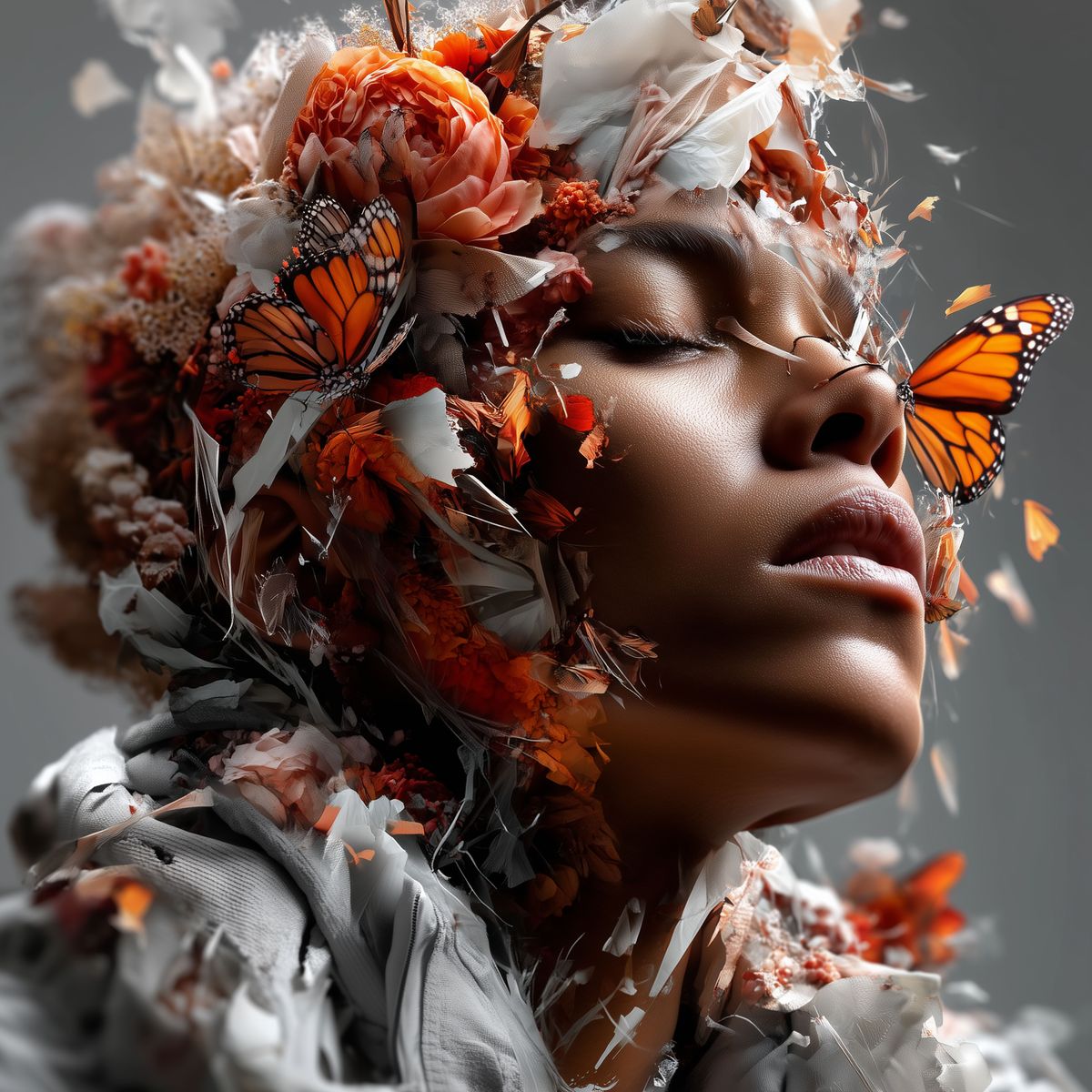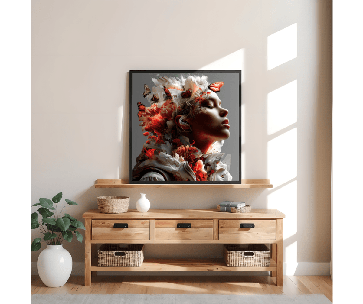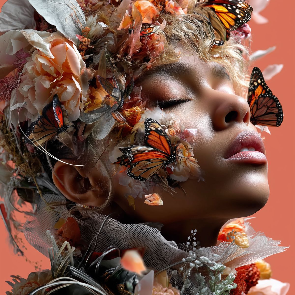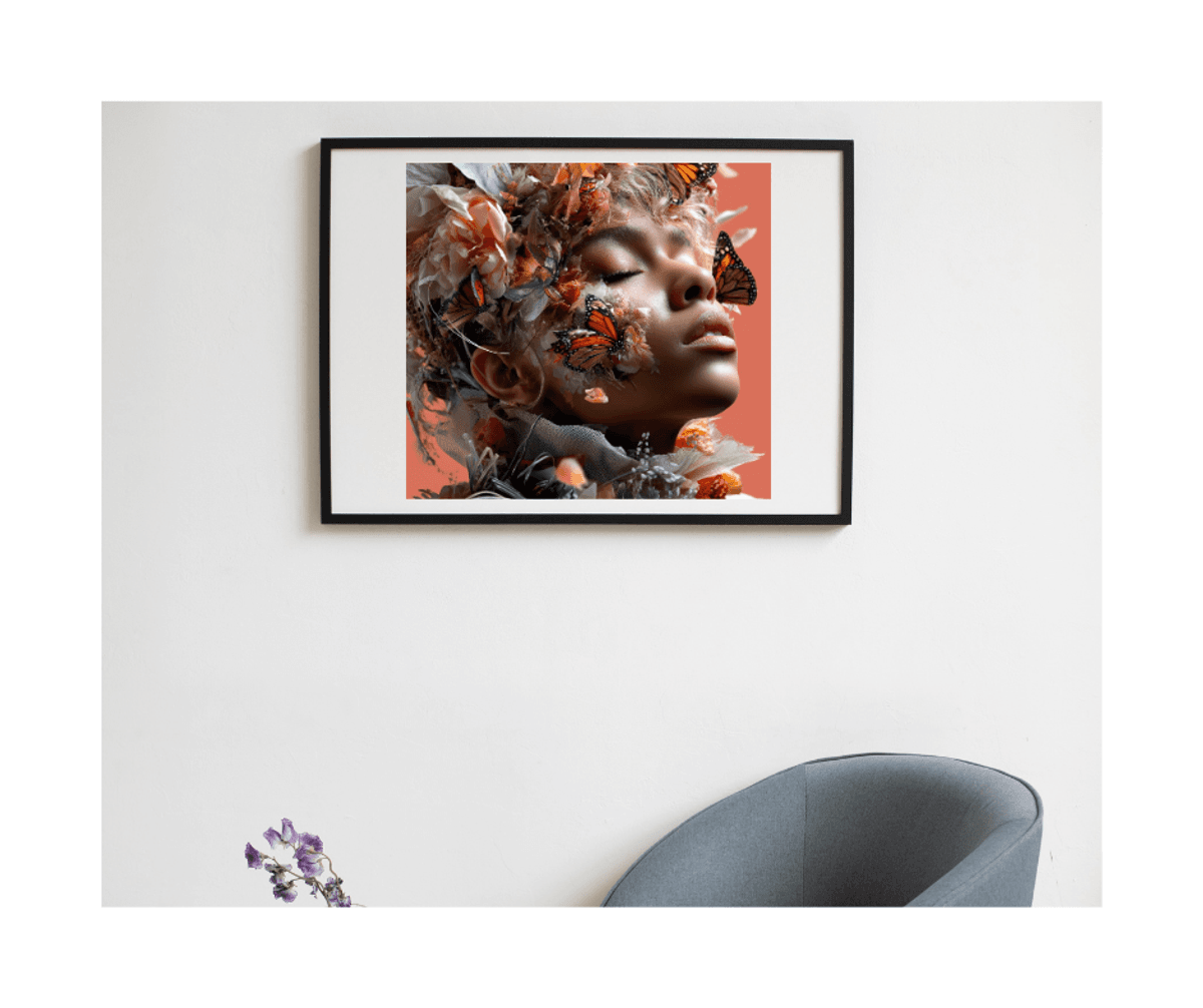 Butterfly Collage Portrait Art – Surreal Woman with Monarch Butterflies & Floral Crown, Ethereal Fantasy Digital Wall Print