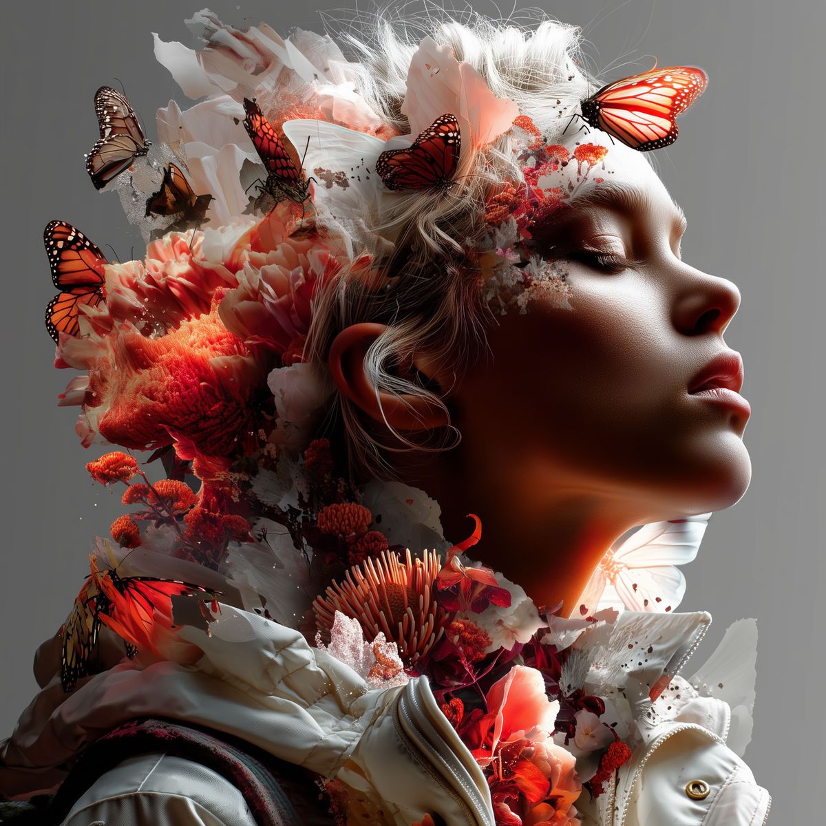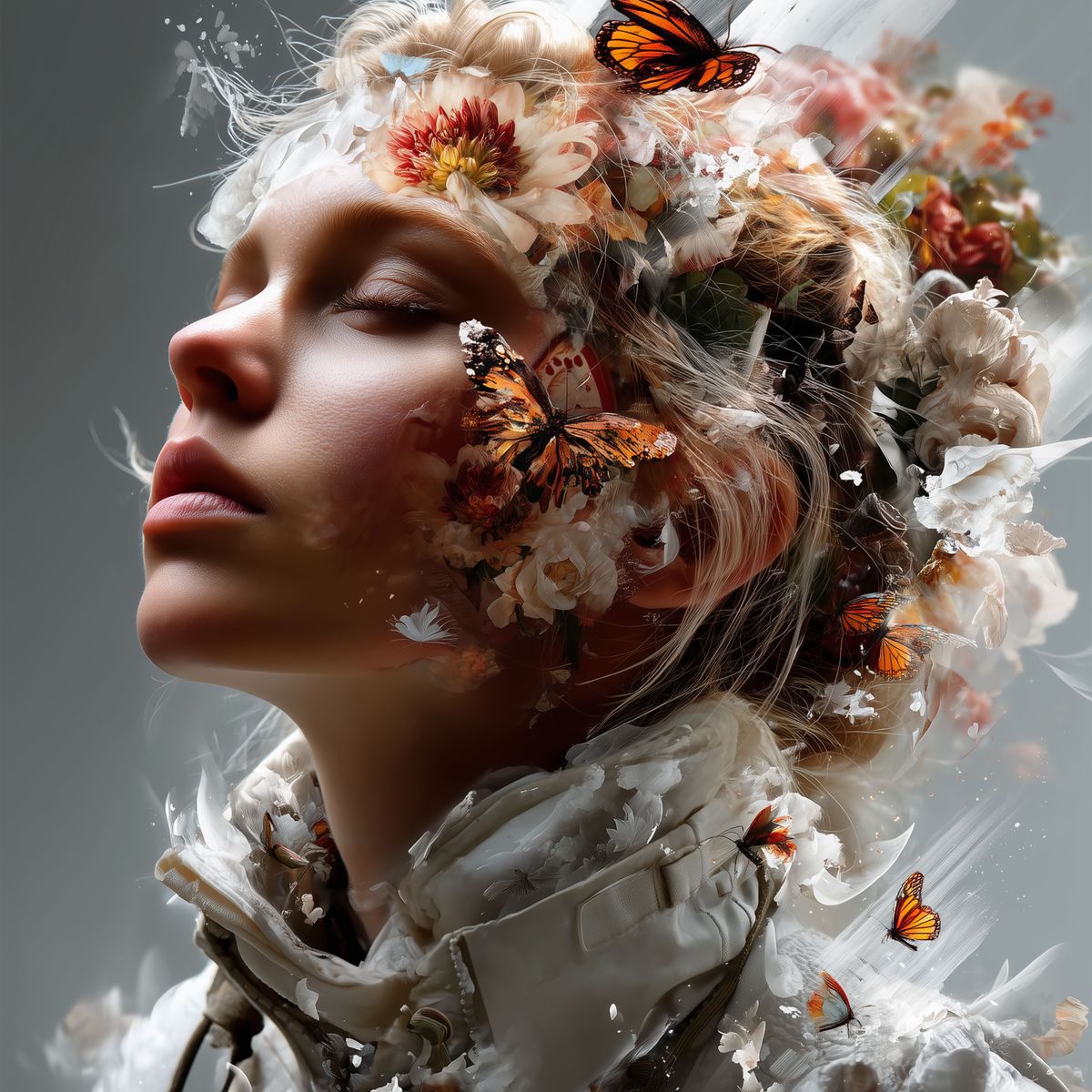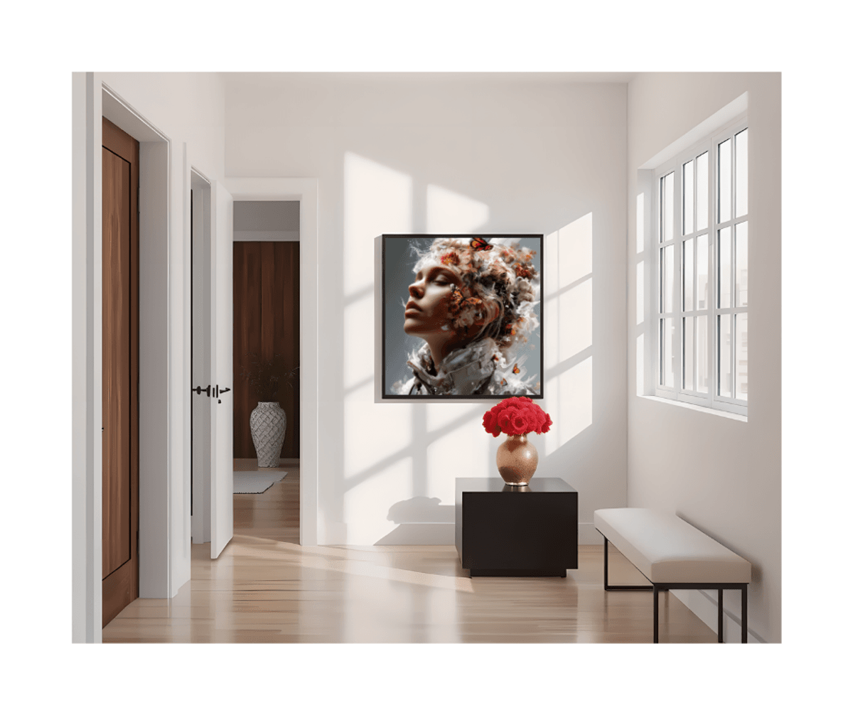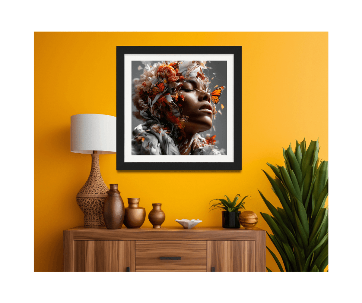 Butterfly Collage Portrait Art – Surreal Woman with Monarch Butterflies & Floral Crown, Ethereal Fantasy Digital Wall Print