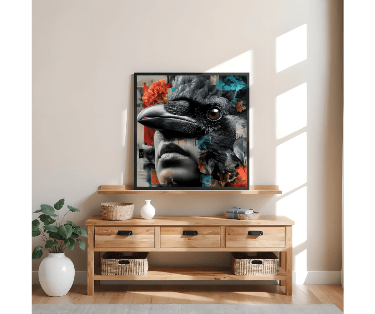 Raven Collage Portrait – Surreal Woman with Black Bird, Moody Mixed Media Art Print for Gothic Fantasy Decor & Gifts