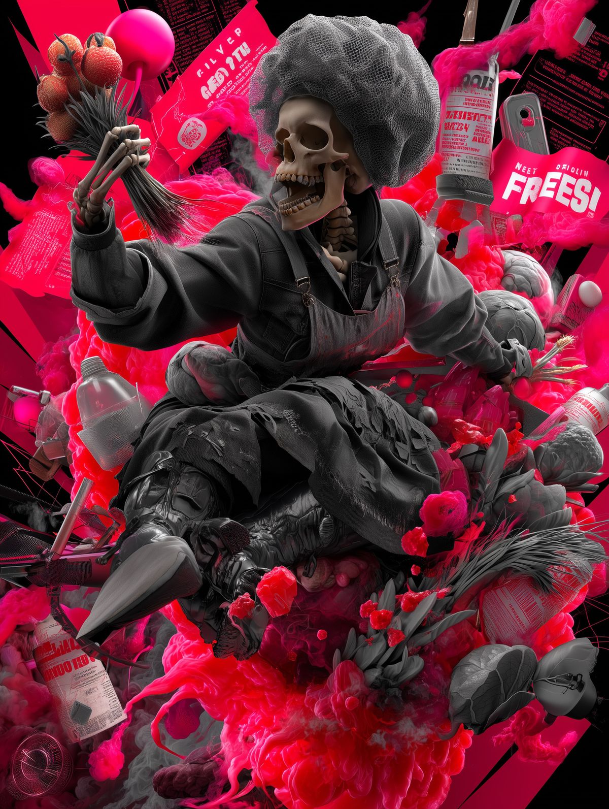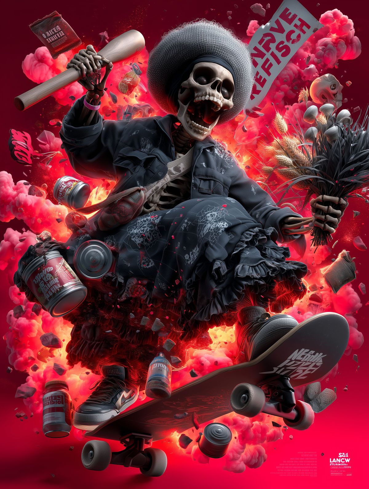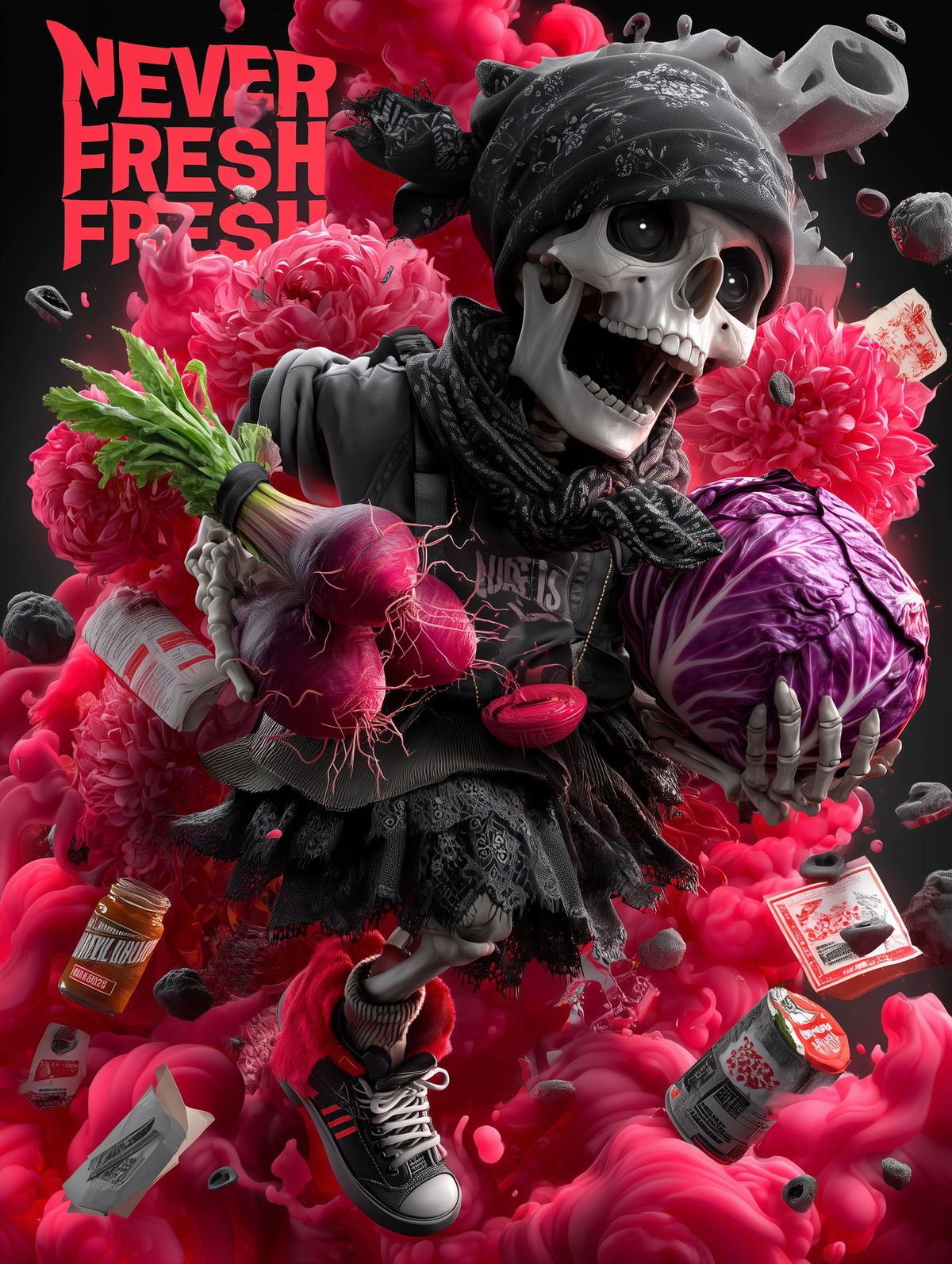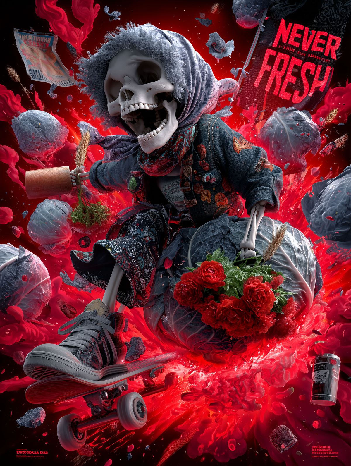Babushka Skeleton Skater Print – Skull in Headscarf Riding Exploding Cabbage with Red Flowers & “Never Fresh” Protest