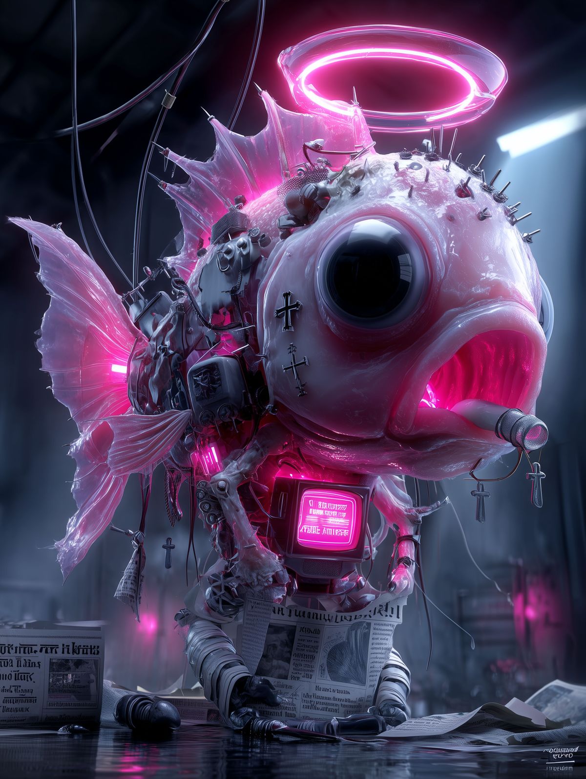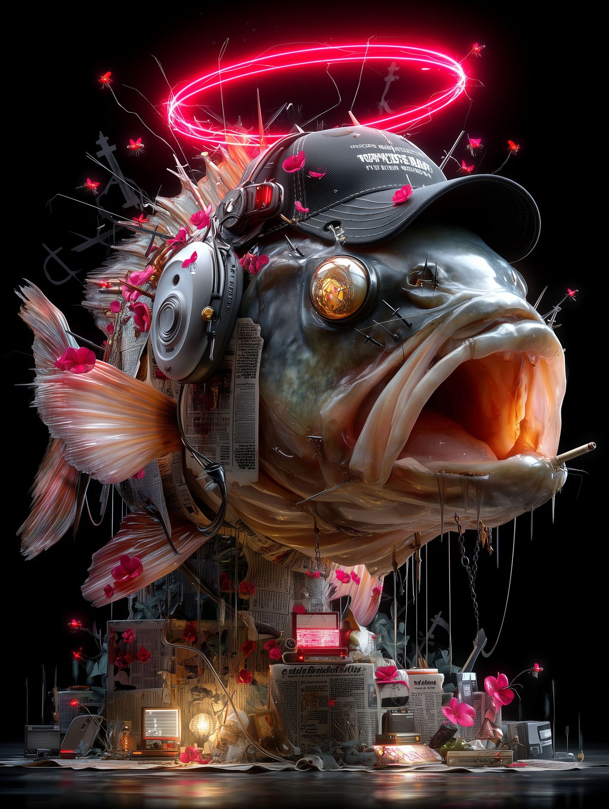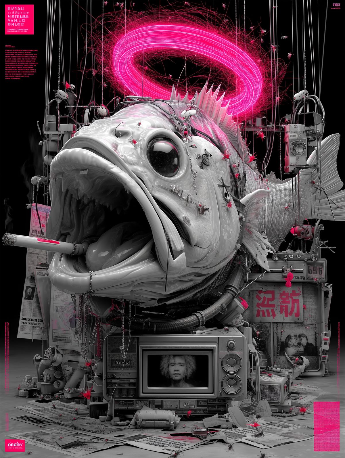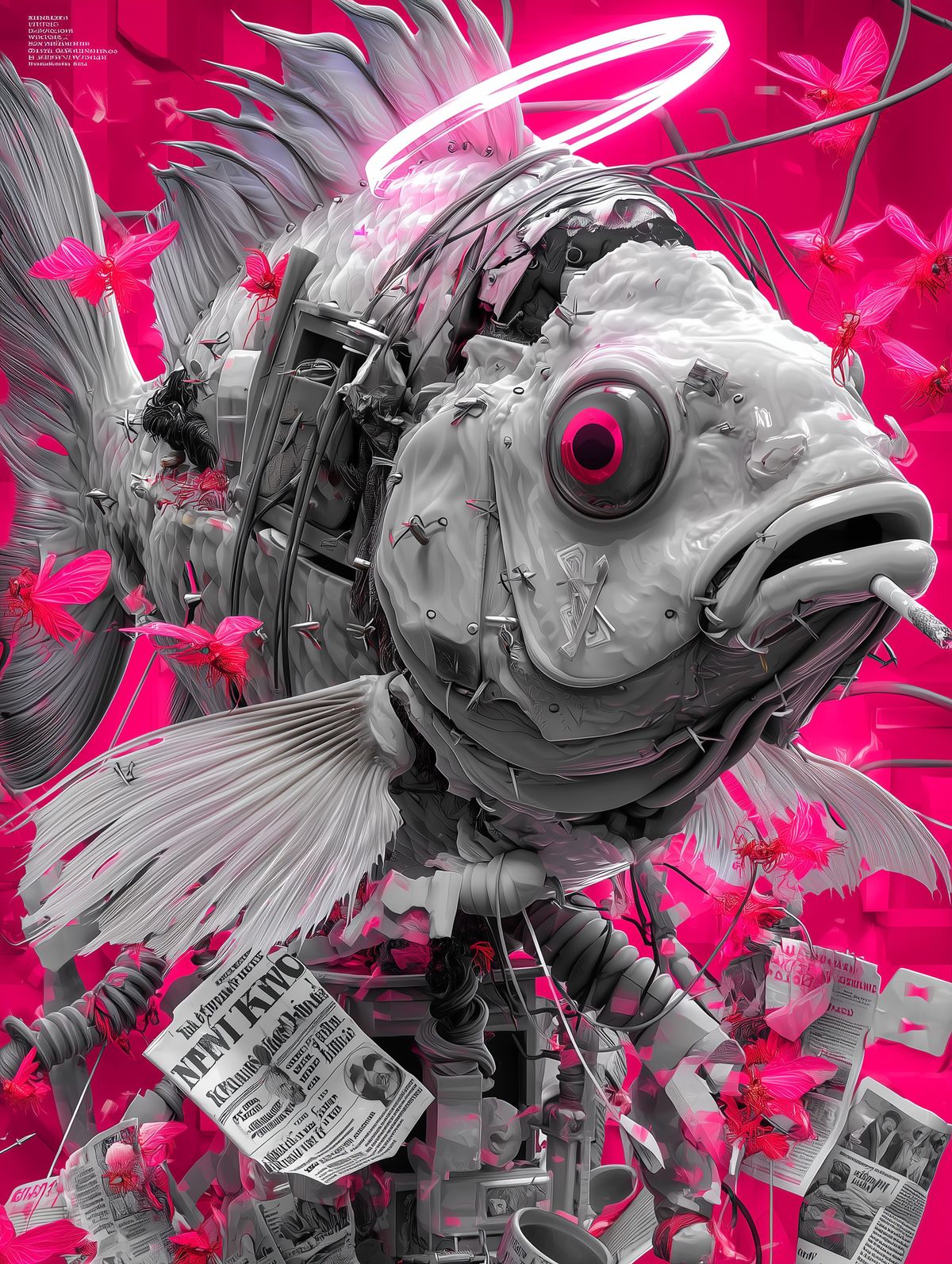 Cyberpunk Rotting Fish Art Print – Neon Red Surreal Illustration with Halo, Wires, and Butterflies