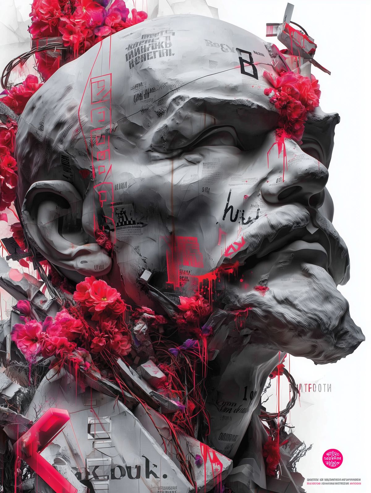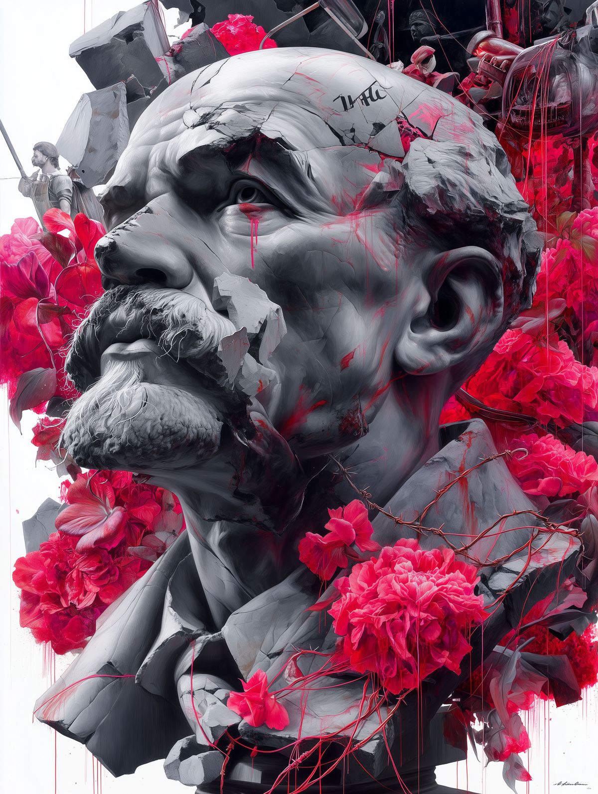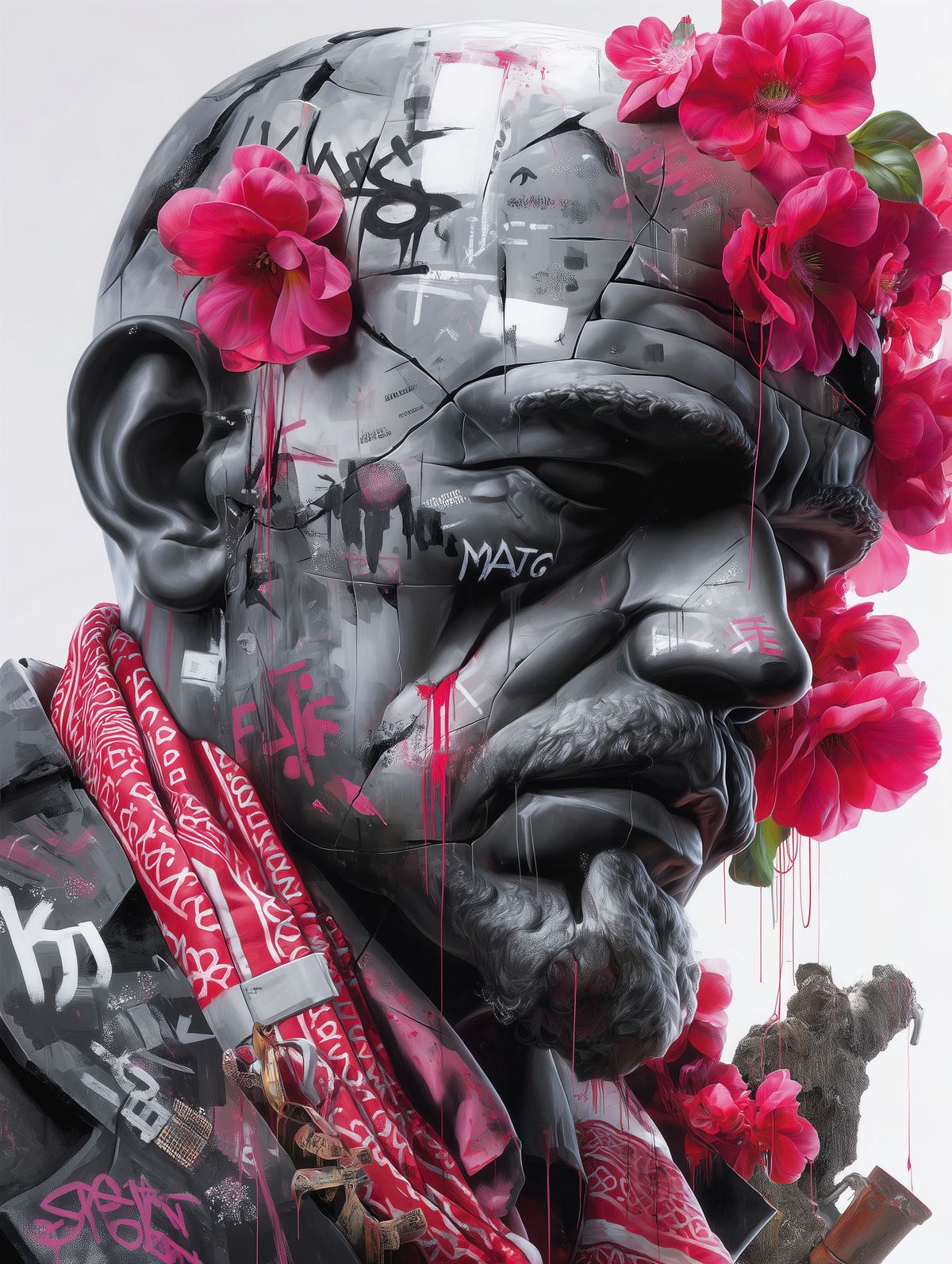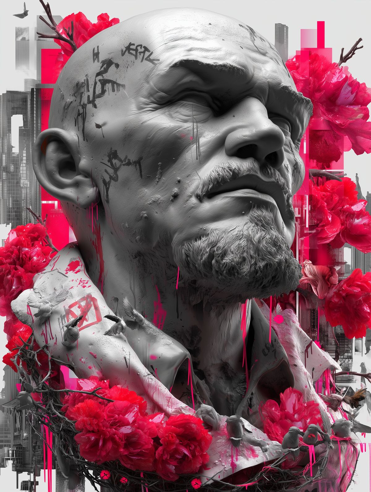 Lenin Bust Art Print – Black & Red Polska Trash Tattoo-Style Crying Concrete Statue with Urban Graffiti and Flowers