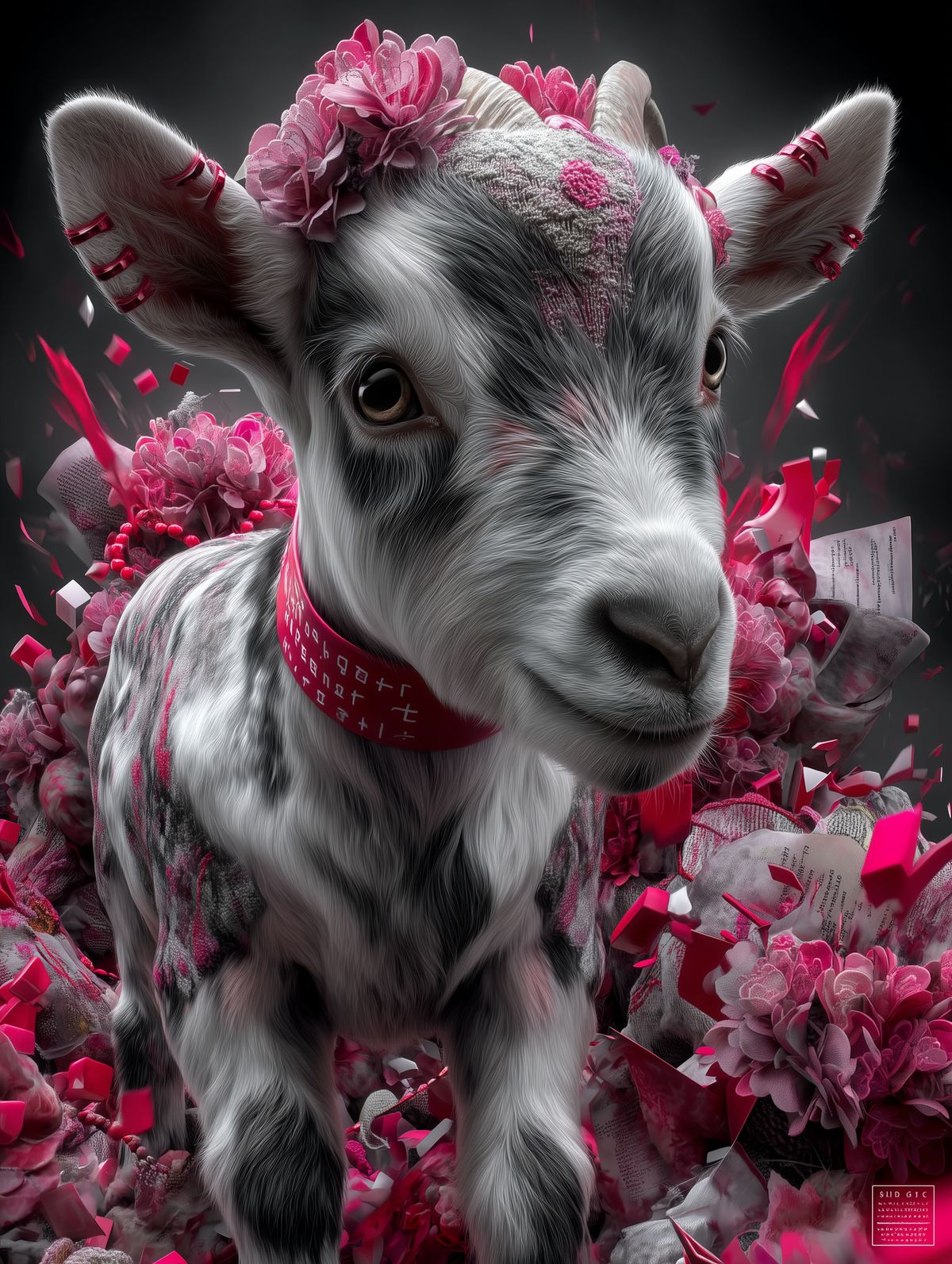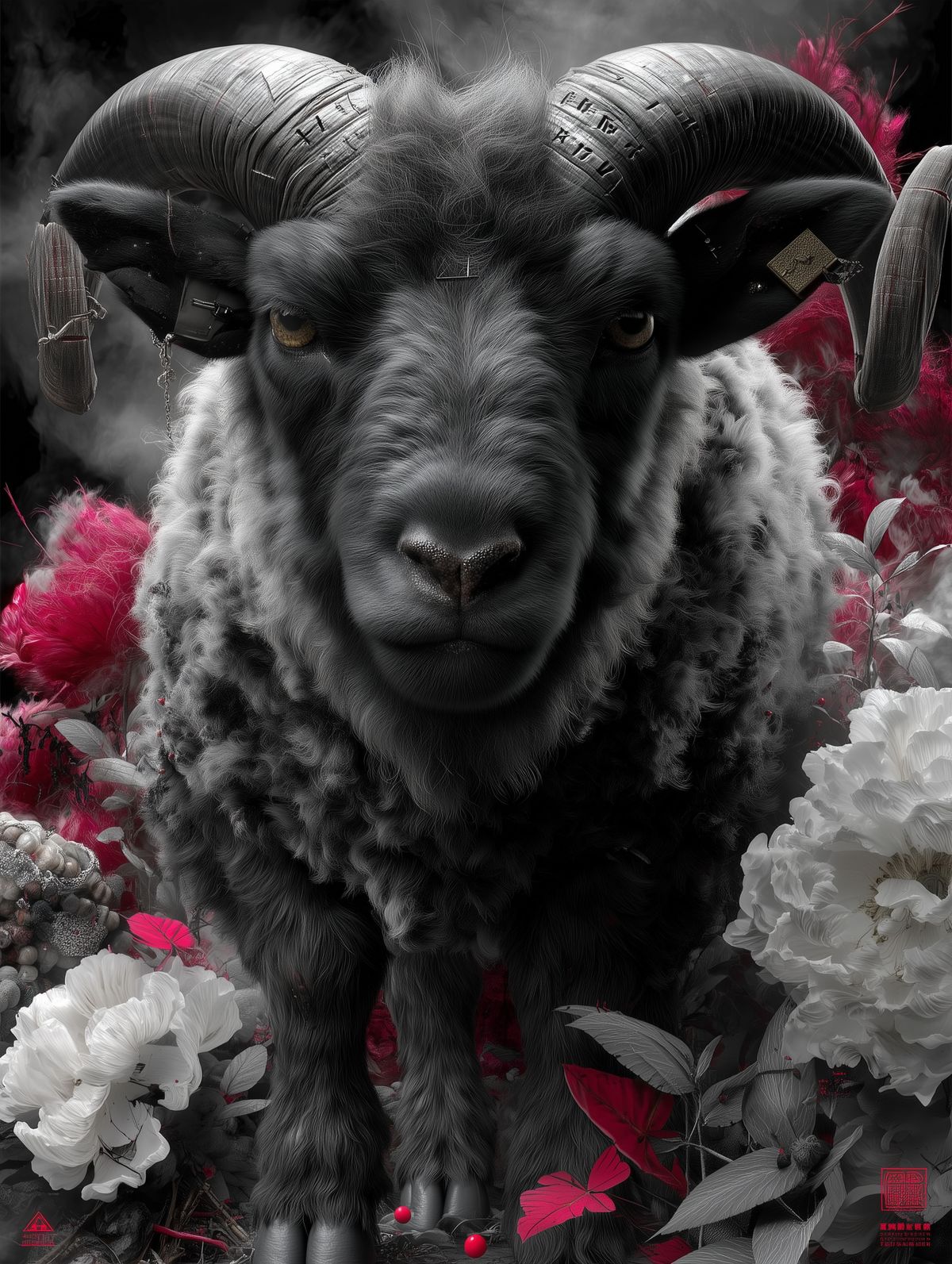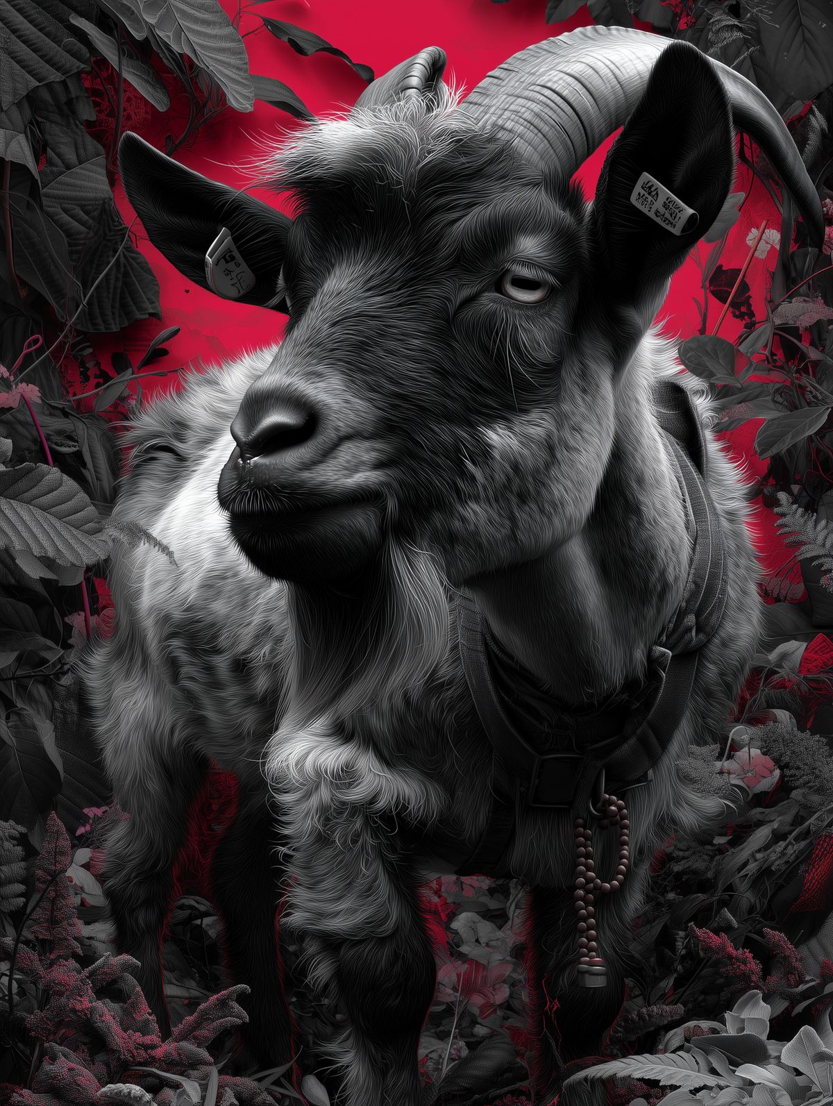 Surreal Goat Art Print – Six-Eyed Goat with Embroidered Horns, Pink Flowers & Mythic Red Accents