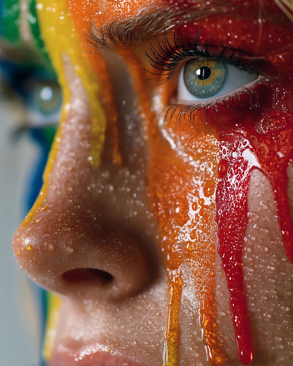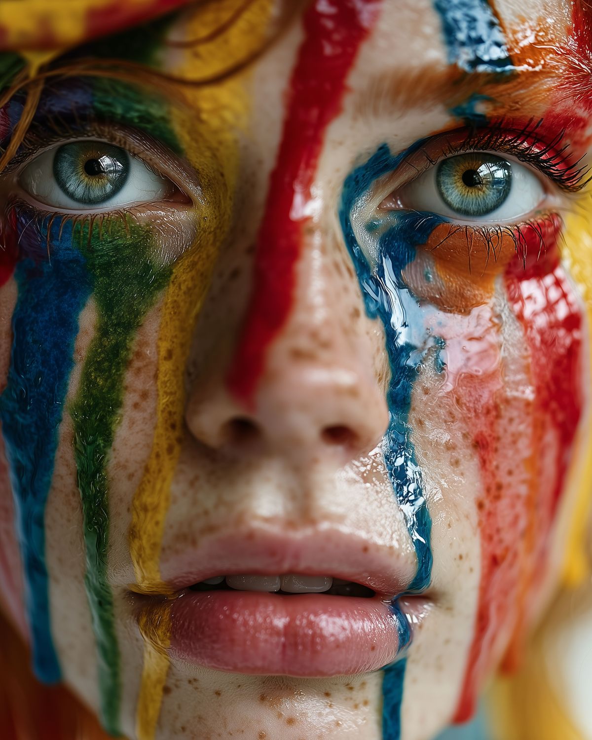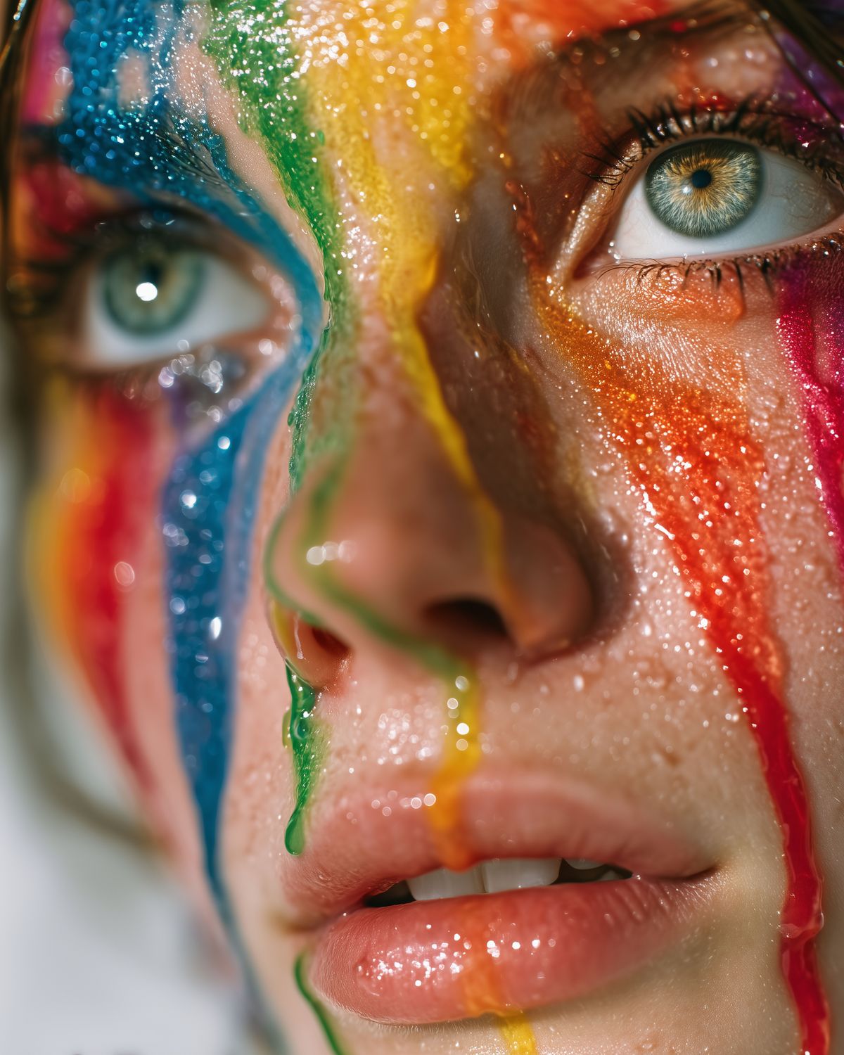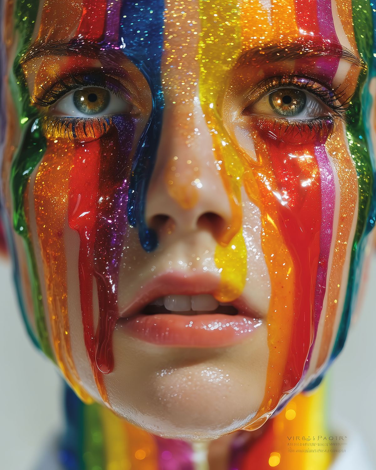 Rainbow Drip Woman Portrait – Vivid Close-Up Fantasy Face with Glitter Paint, LGBTQ Pride Art Print