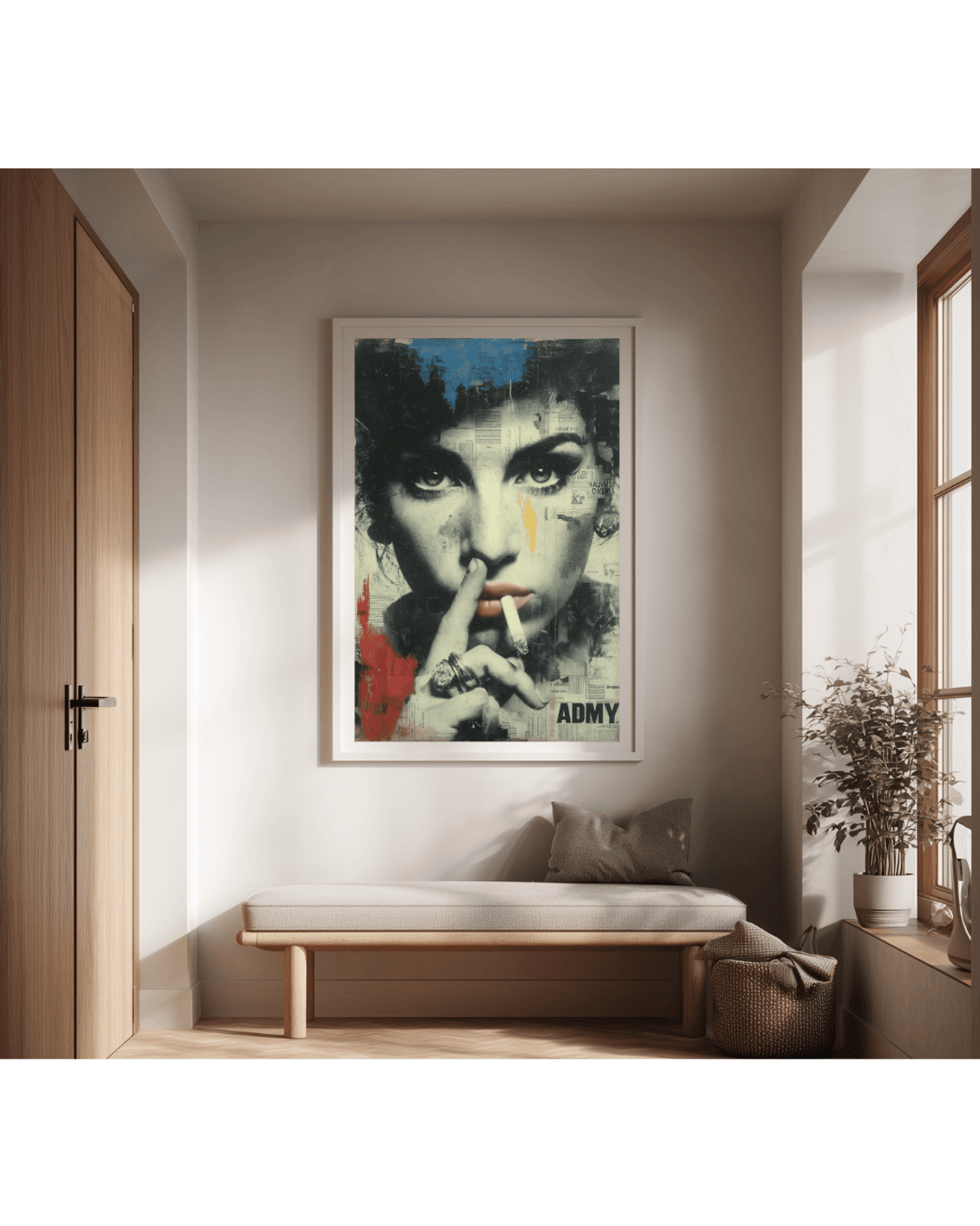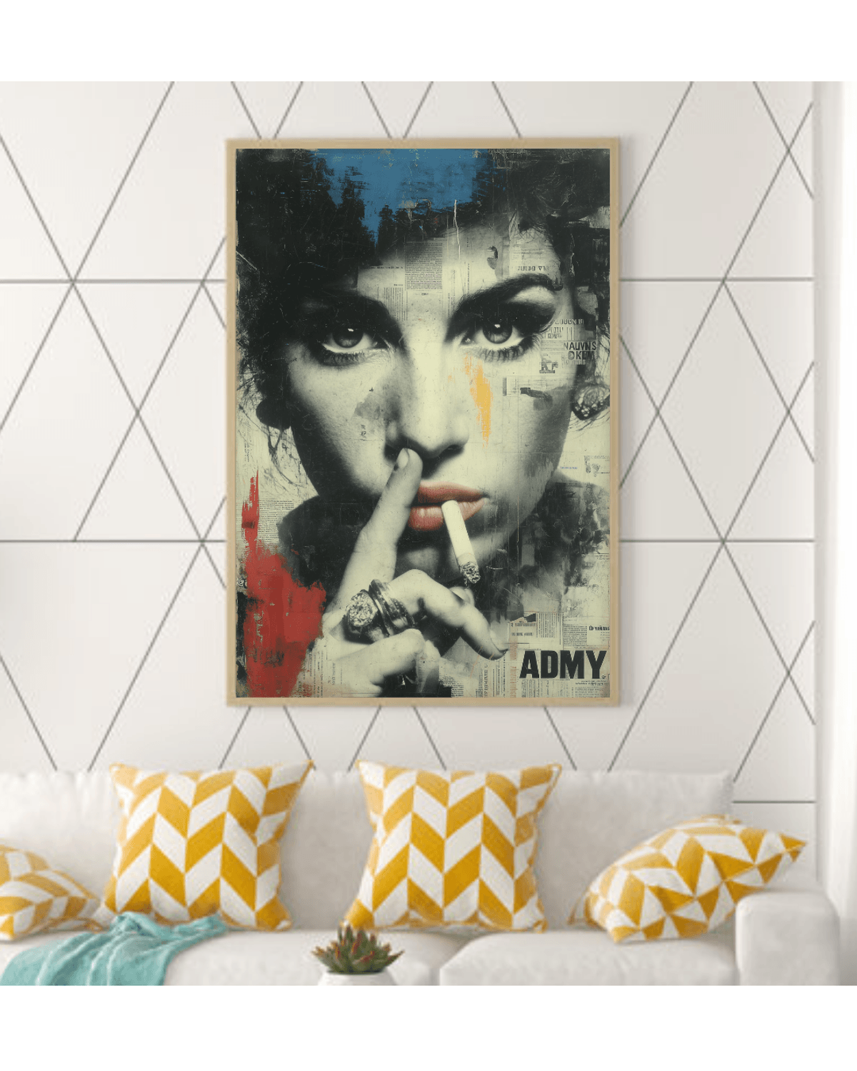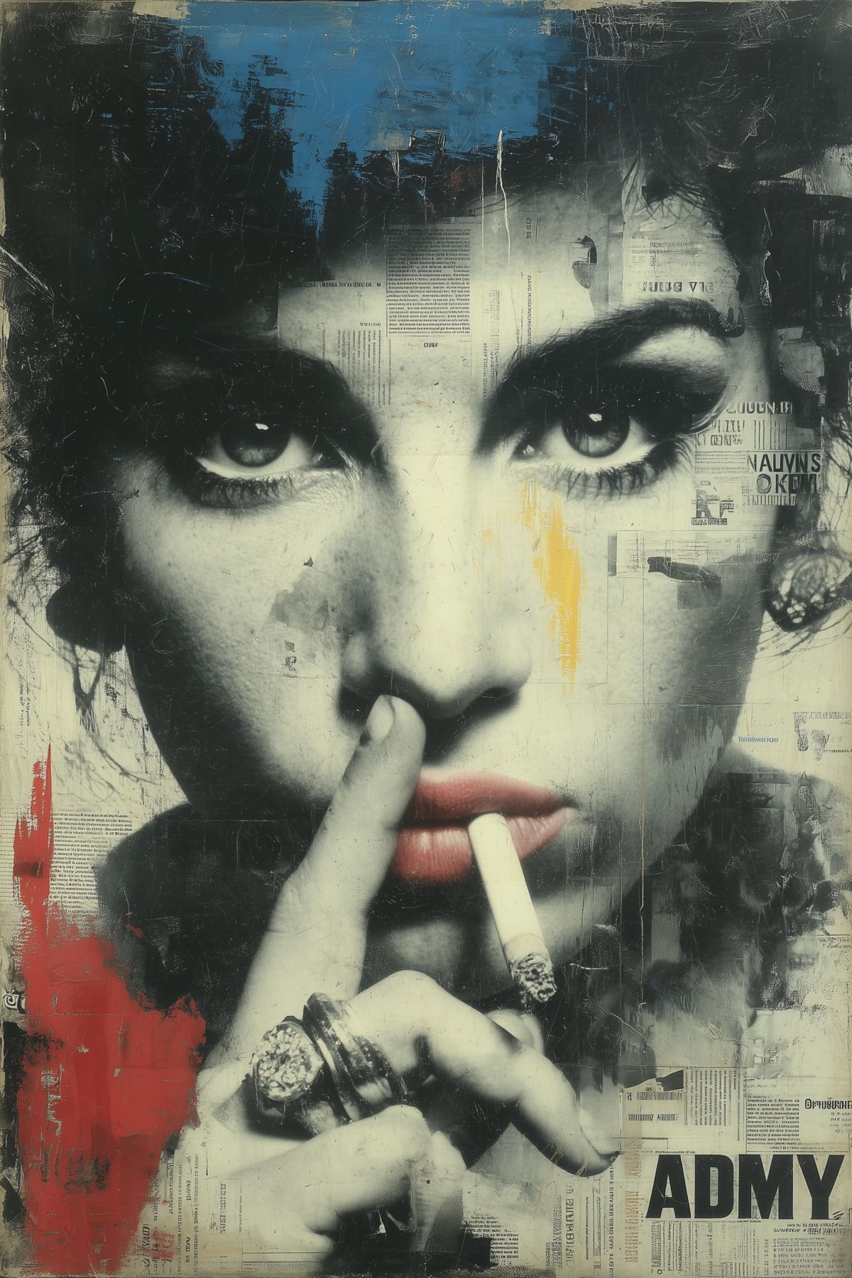 Amy Winehouse Graffiti Pop Art Print – Bold Urban Collage Portrait with Newspaper Texture, Mixed Media Style, Digital Wall Art Poster