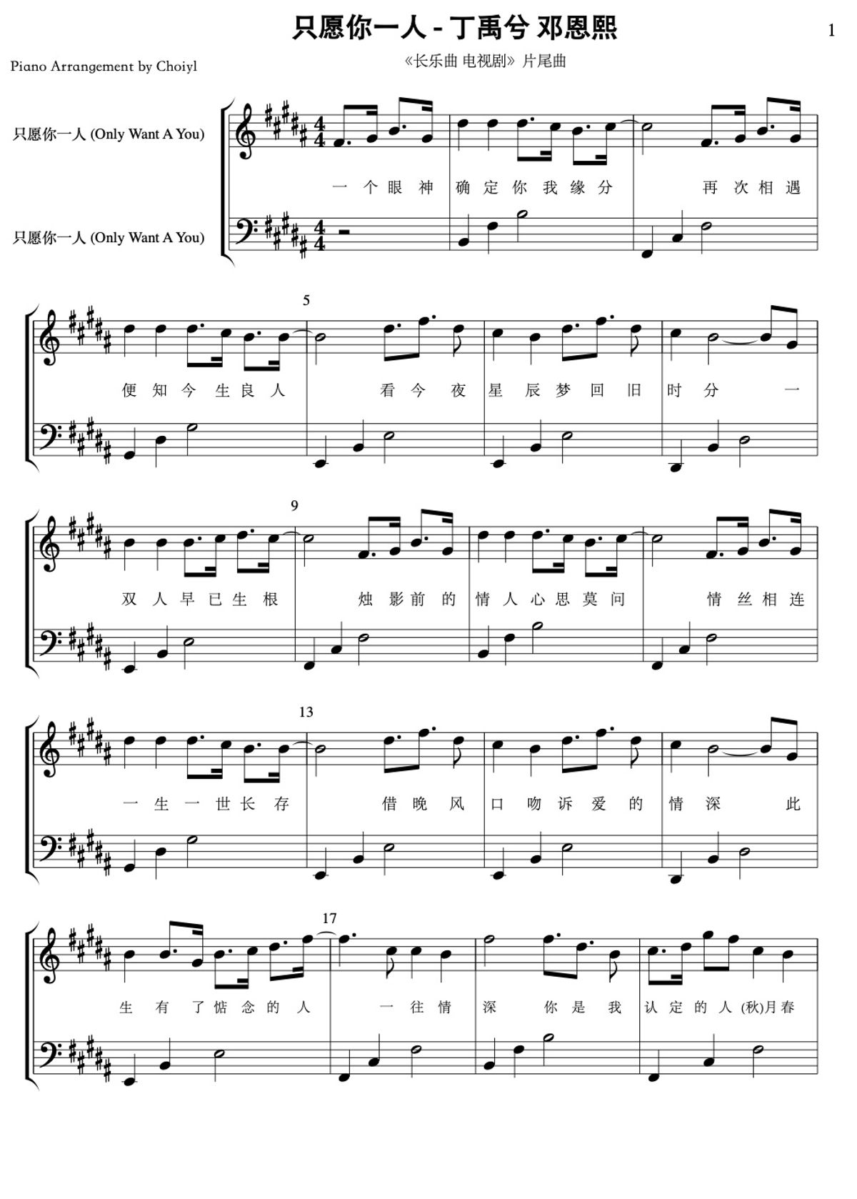 【长乐曲】只愿你一人 (Only Want A You) - 丁禹兮 (Ryan Ding), 邓恩熙 (Ancy Deng)|钢琴谱 Piano Sheet with lyric