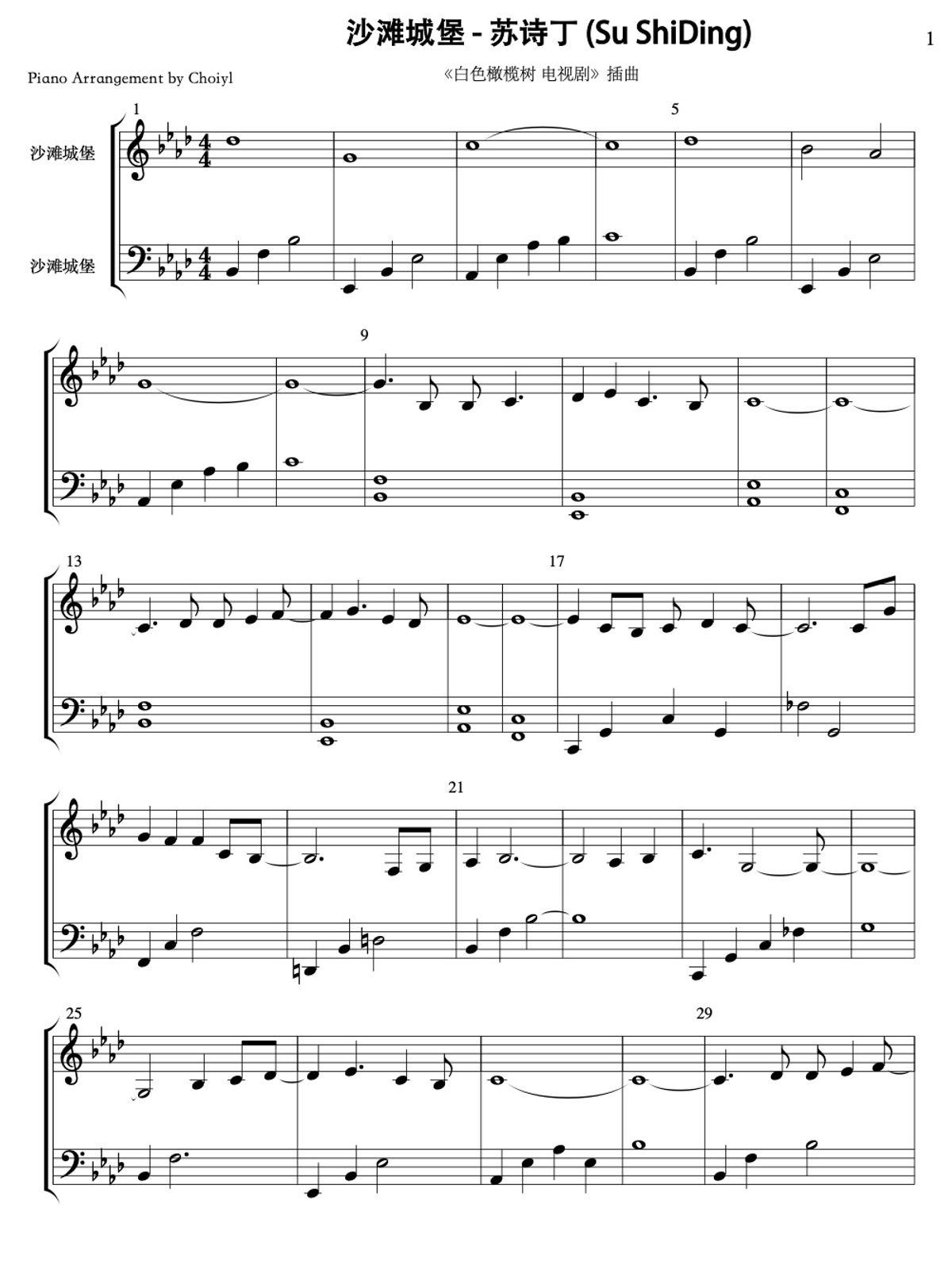 【白色橄榄树】沙滩城堡 (Beach Castle) - 苏诗丁 (Su Shiding)|钢琴谱 Piano Sheet