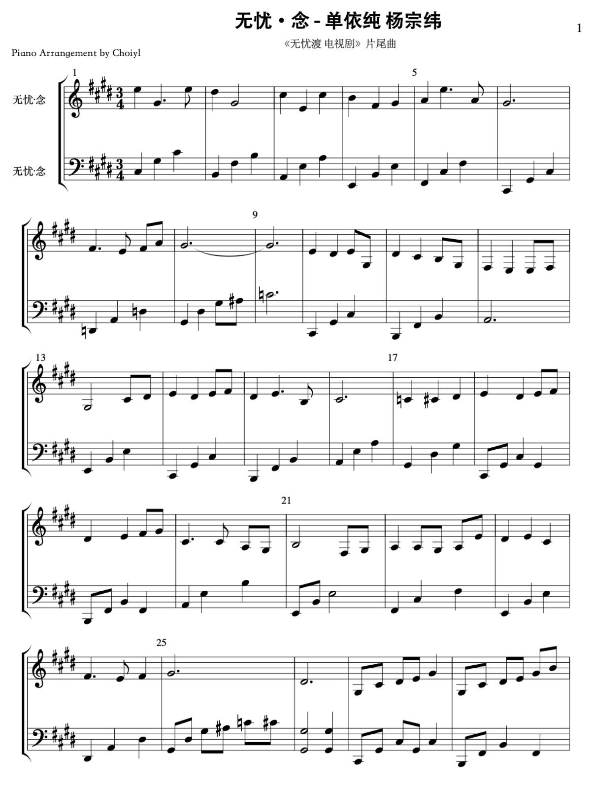 【无忧渡】无忧·念 (Worry Free Longing) - 单依纯 (Shan Yichun), 杨宗纬 (Aska Yang) 钢琴谱 Piano Sheet