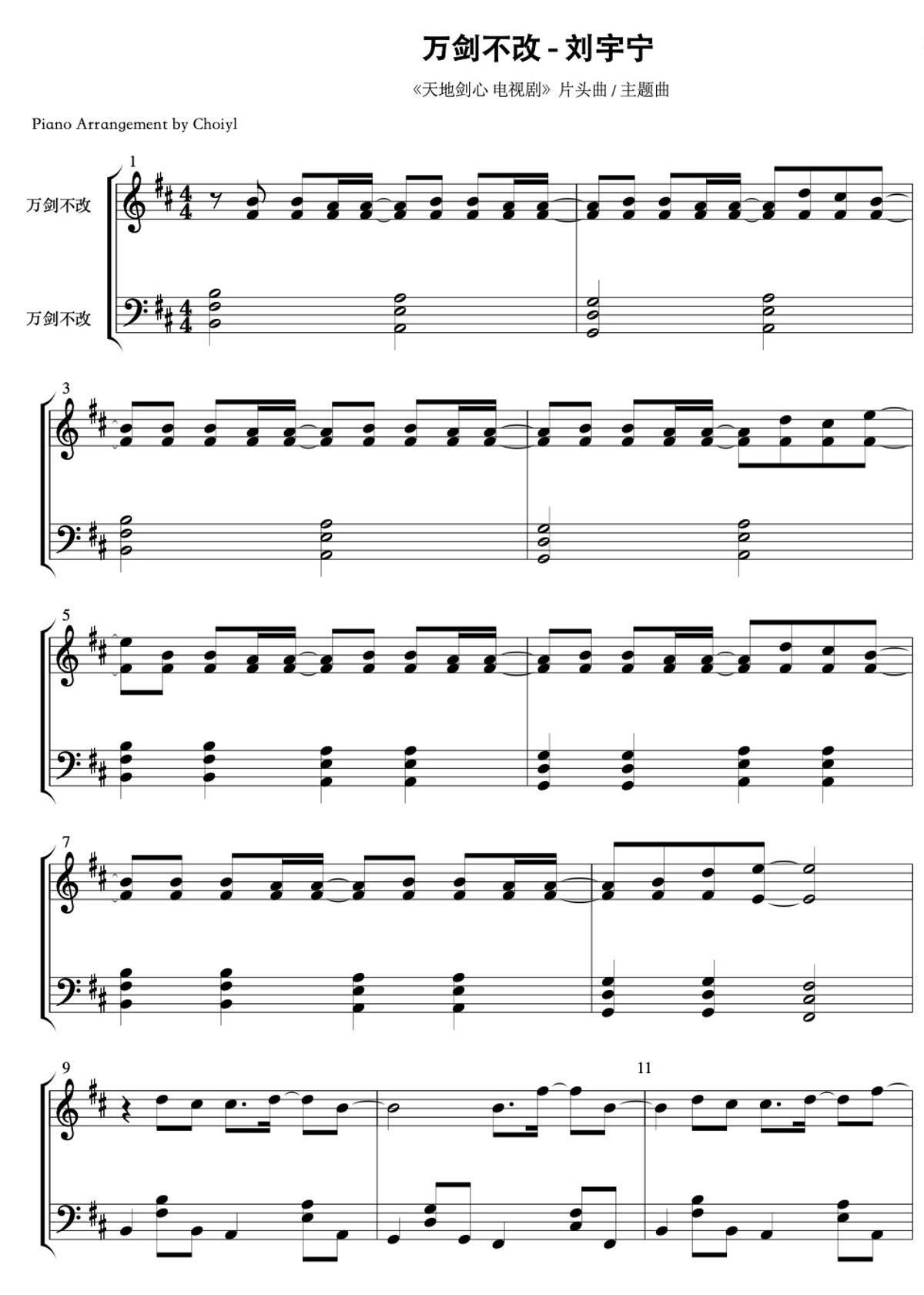 【天地剑心 Sword and Beloved】万剑不改 (Unyielding Against Ten Thousand Swords) - 刘宇宁 (Liu Yuning) - 钢琴谱 Piano Sheet
