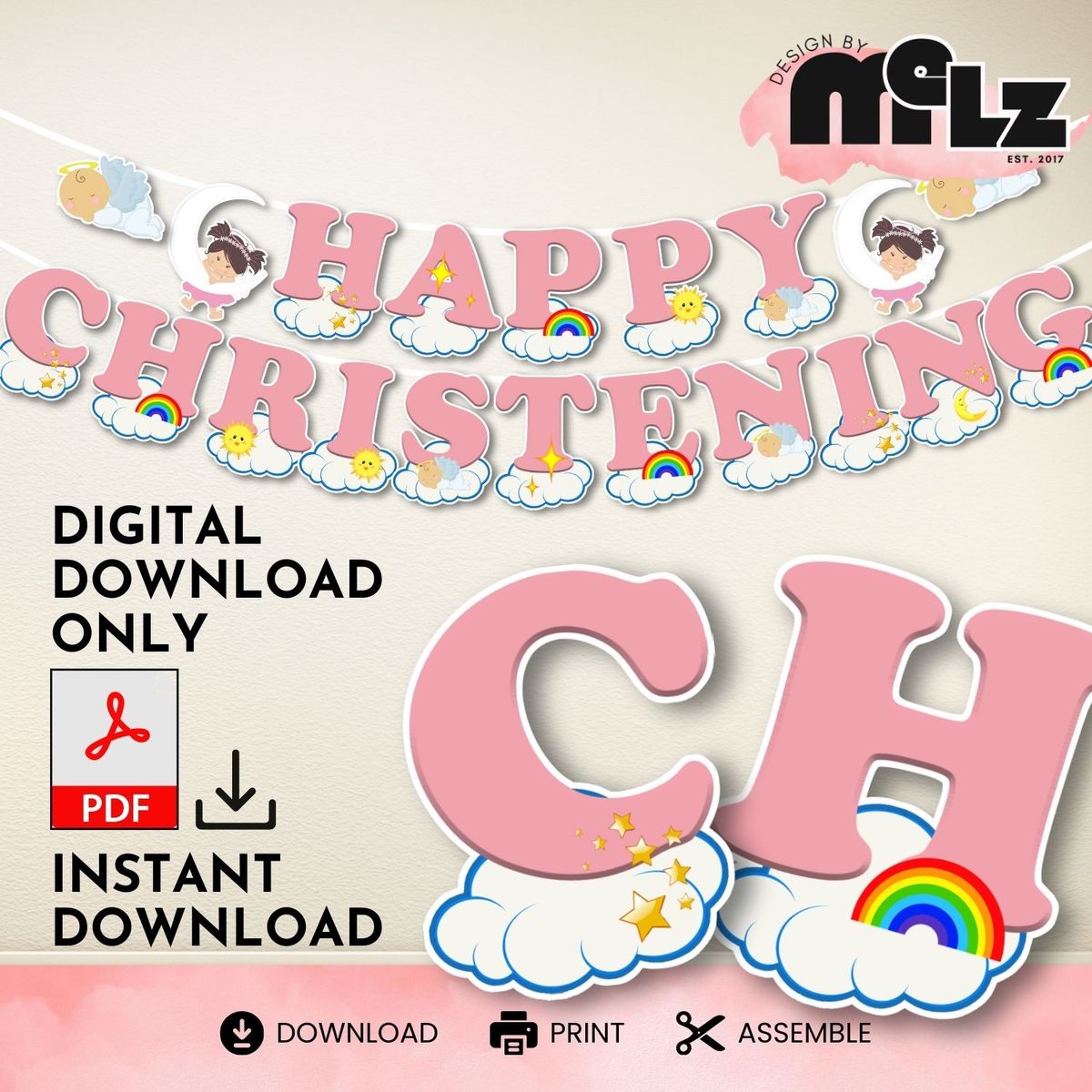 Angels Clouds Happy Christening Banner, Flags, Bunting, Baptism, Baby Girl, Pink Decor, Party Decor, Decoration, Printable, Instant Download