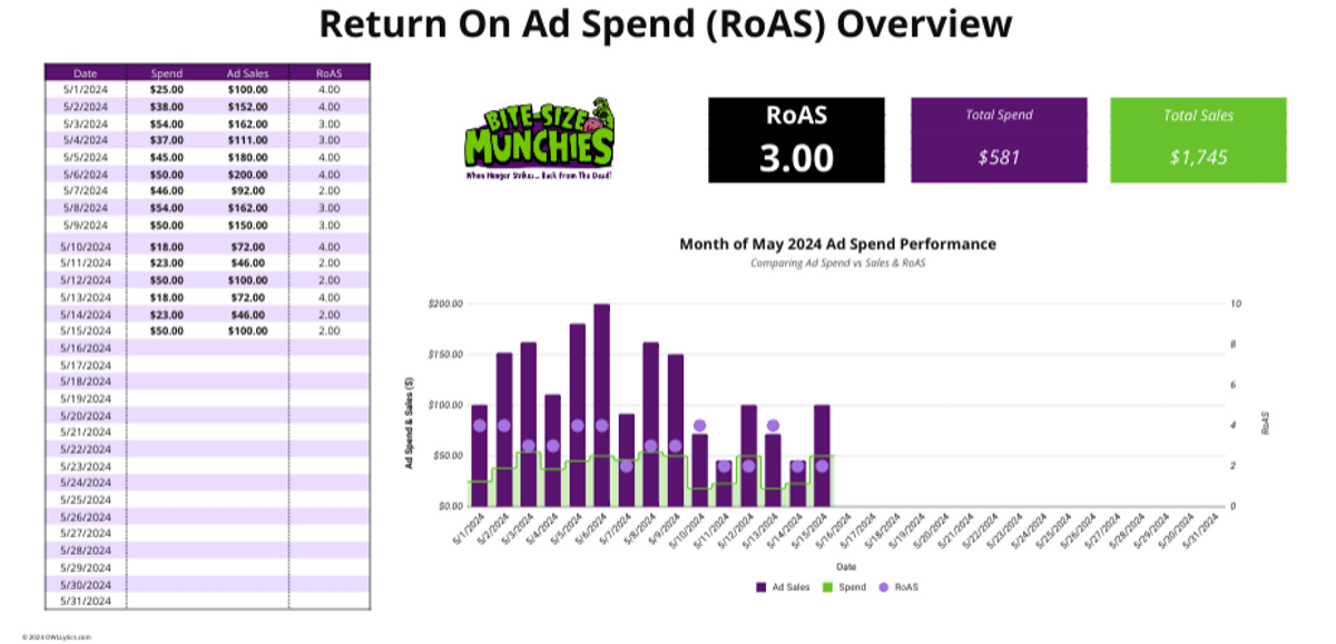 Return on Ad Spend (ROAS) Performance Dashboard Report | Google Sheets Dashboard