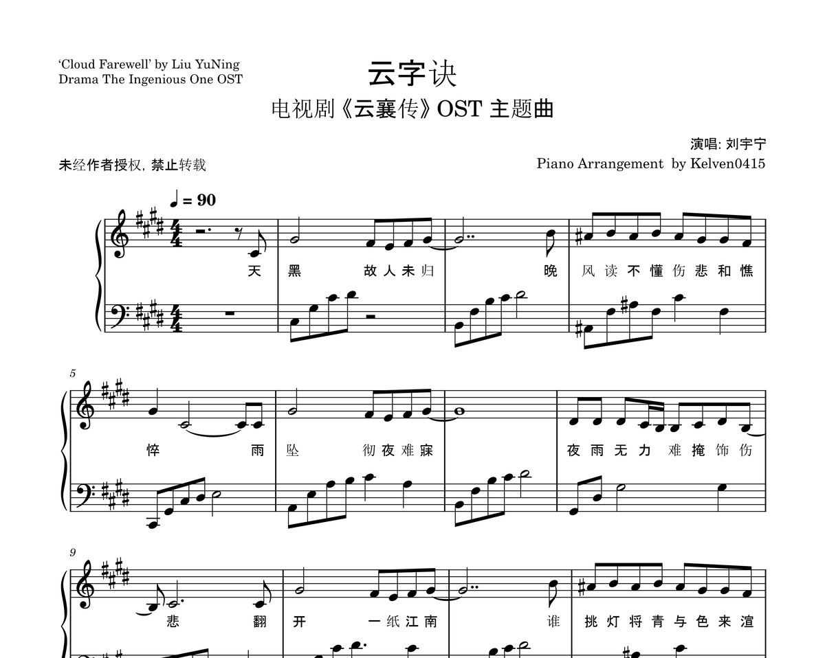刘宇宁 Liu YuNing - 云字诀 钢琴谱 Piano Sheet🎹