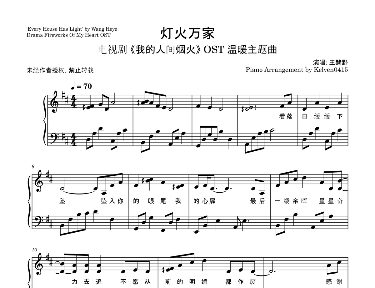 王赫野 Wang Heye - 灯火万家 钢琴谱 Piano Sheet🎹