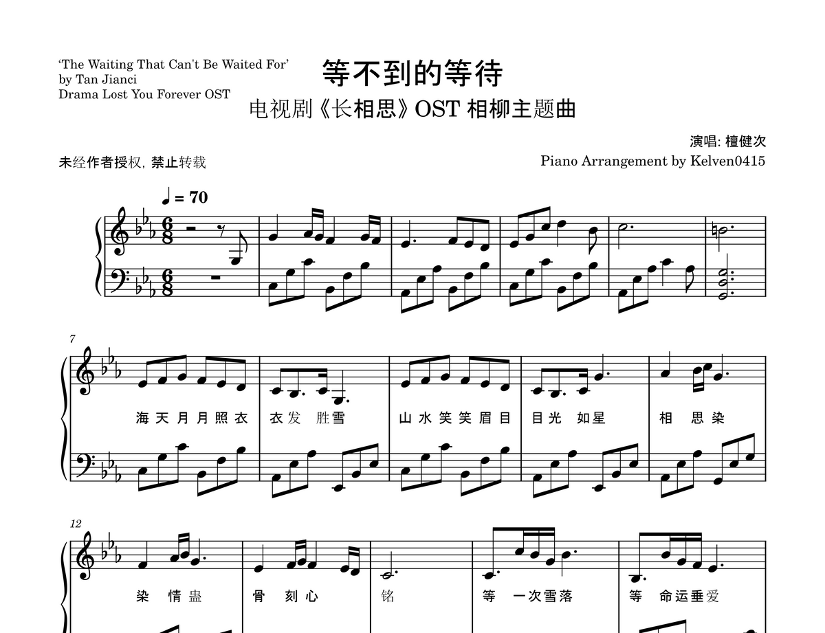 檀健次 Tan Jianci - 等不到的等待 钢琴谱 Piano Sheet🎹