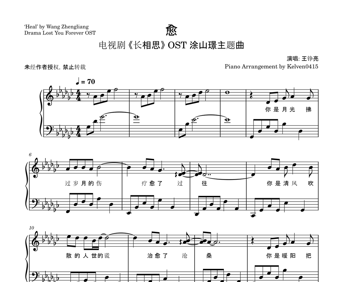 王铮亮 Wang Zhengliang - 愈 钢琴谱 Piano Sheet🎹