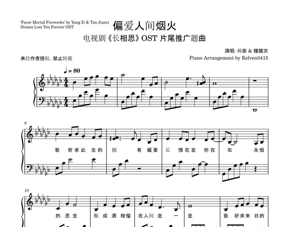 杨紫 YangZi & 檀健次 Jianci - 偏爱人间烟火 钢琴谱 Piano Sheet🎹