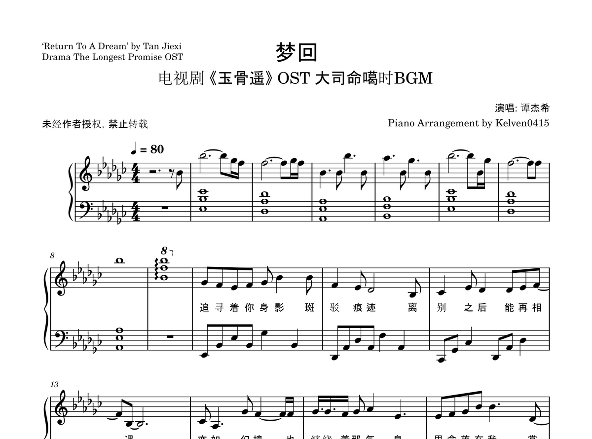 谭杰希 Tan Jiexi - 梦回 钢琴谱 Piano Sheet🎹