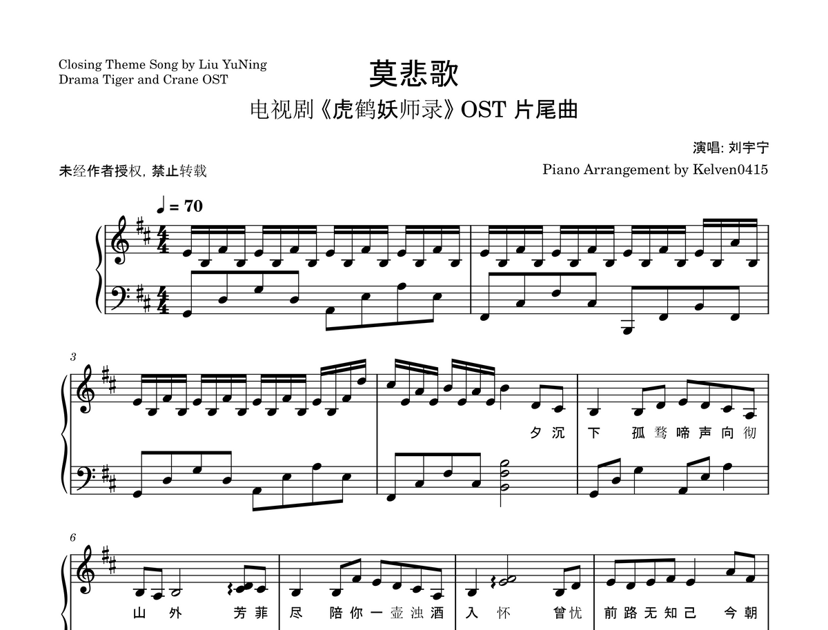 刘宇宁 Liu YuNing - 莫悲歌 钢琴谱 Piano Sheet🎹