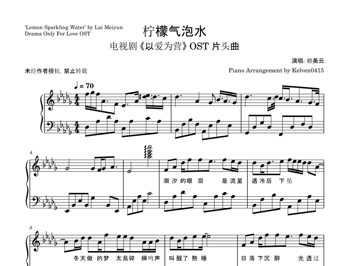 赖美云 Lai Meiyun - 柠檬气泡水 钢琴谱 Piano Sheet🎹
