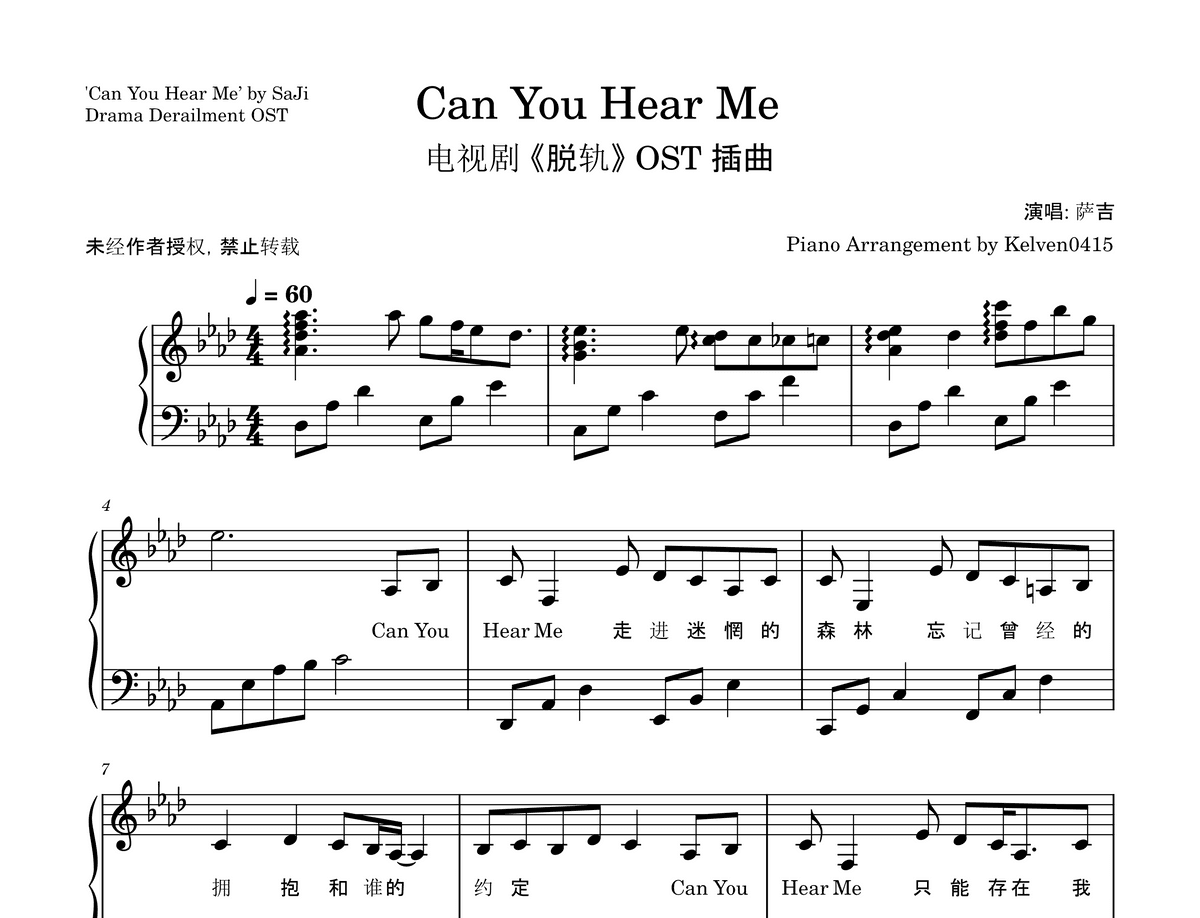 萨吉 Sa Ji - Can You Hear Me 钢琴谱 Piano Sheet🎹