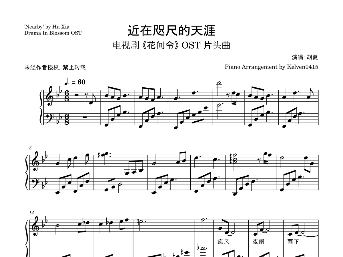 胡夏 Hu Xia - 近在咫尺的天涯 钢琴谱 Piano Sheet🎹