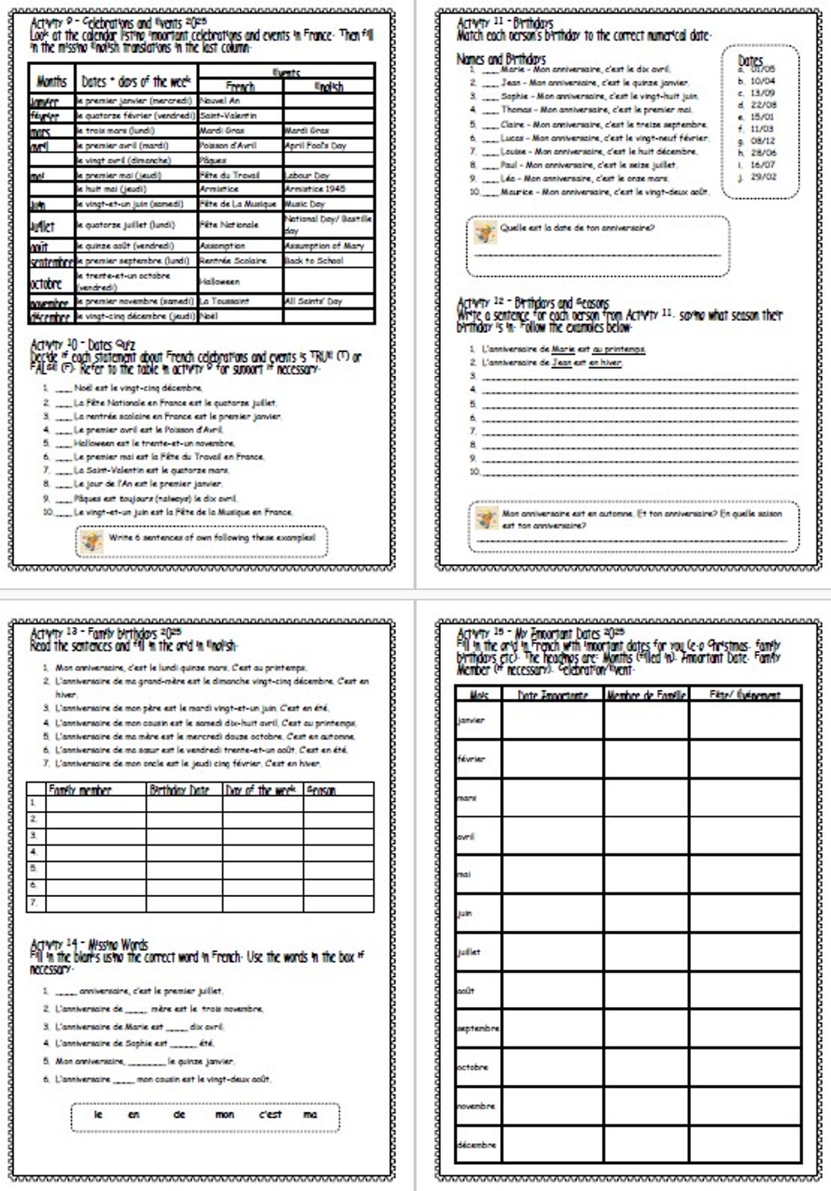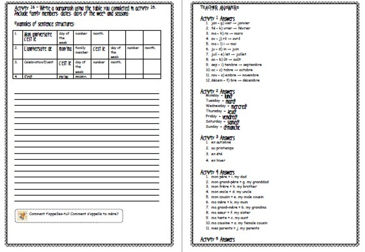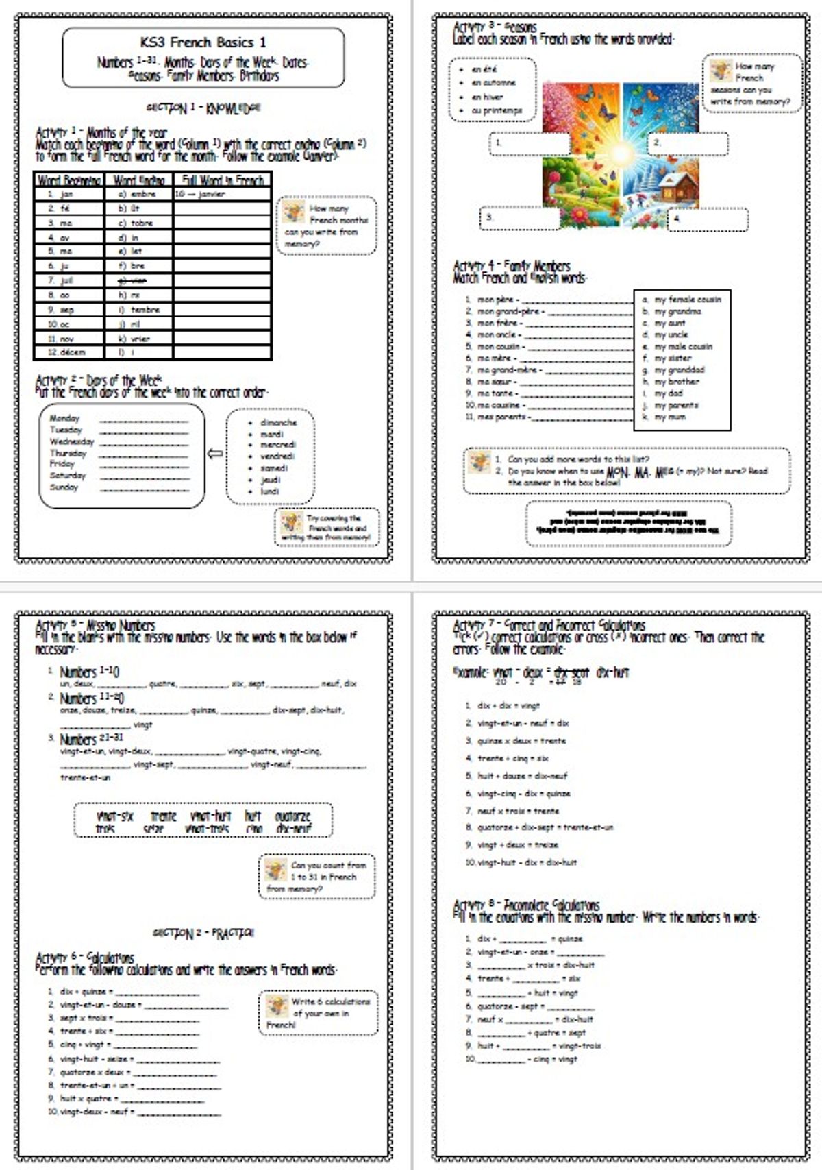 KS3 French Basics 1 Lesson Worksheets + Answers Numbers Dates Birthdays Seasons Family Days of Week