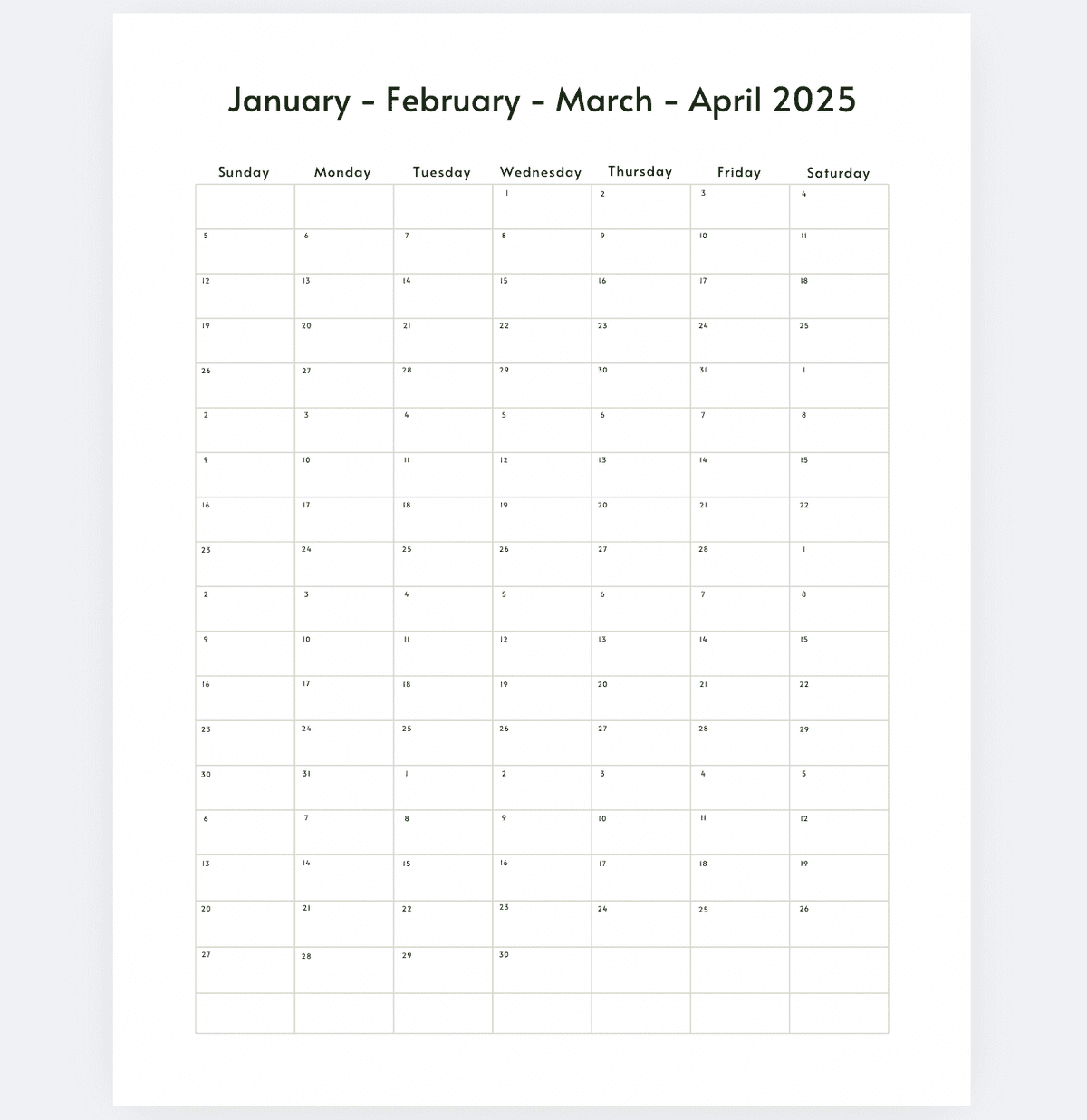 4-Month Calendar - January-April 2025