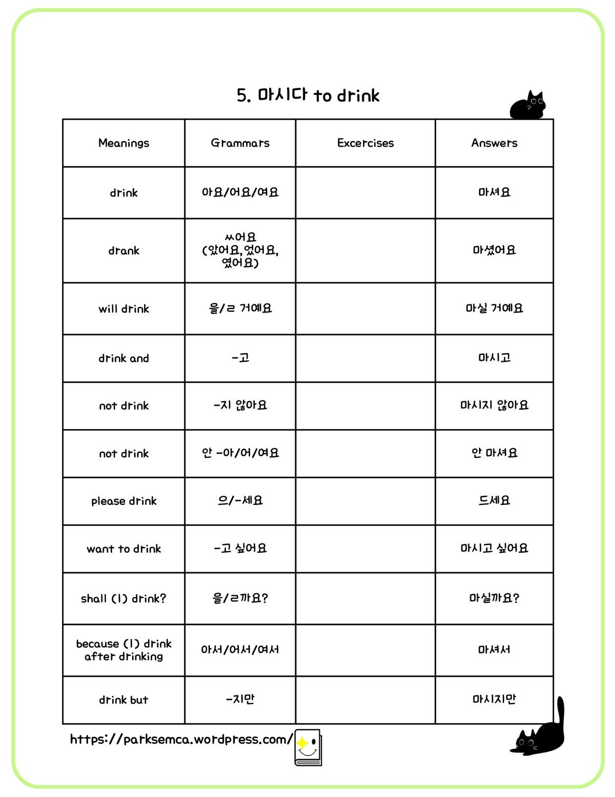 Korean Verb 5 마시다 to drink worksheet