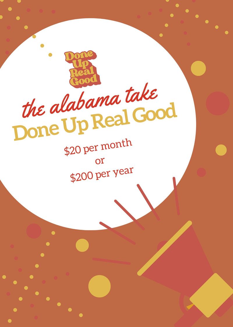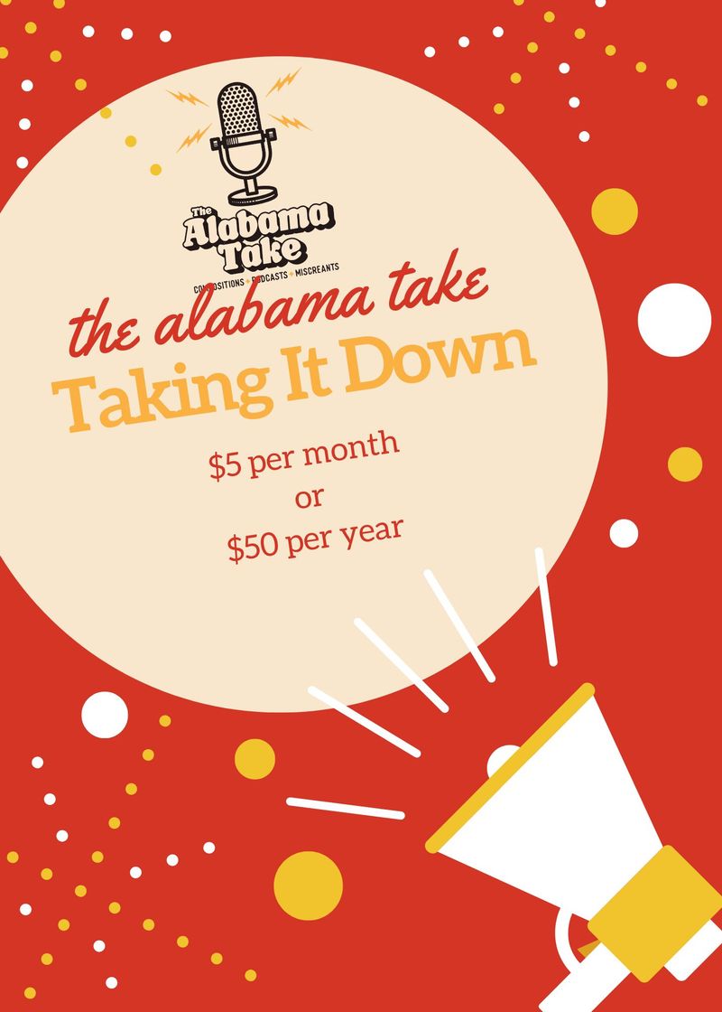 Support monthly and be a part of The Alabama Take's creative journey. Cancel anytime.