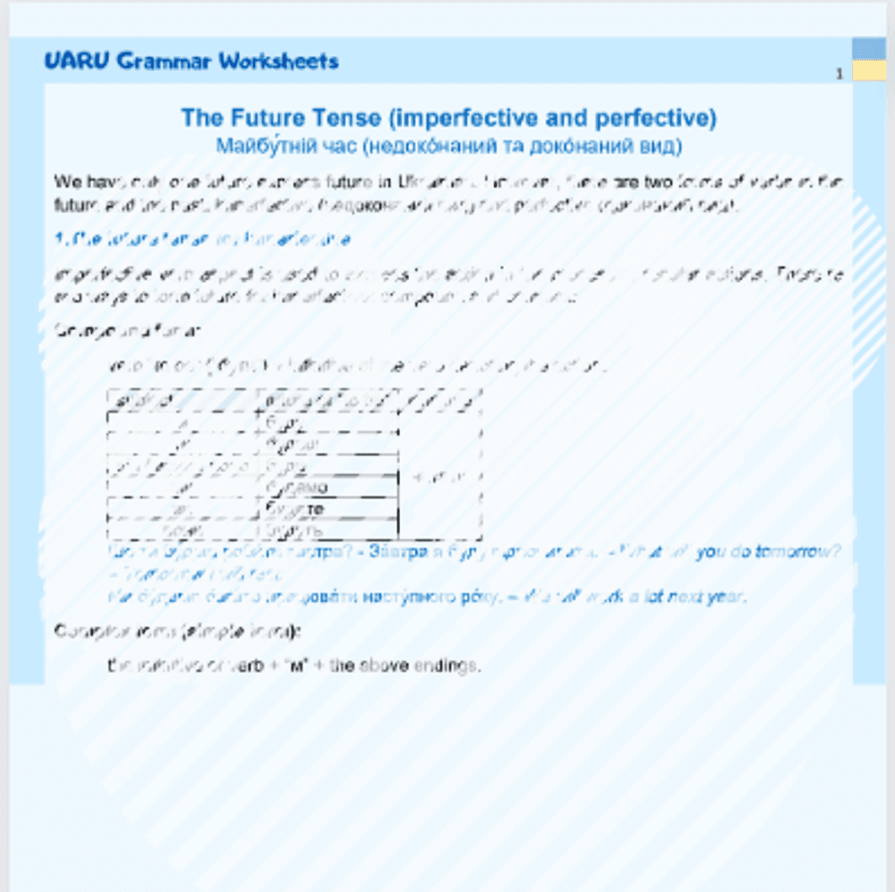 Ukrainian Grammar Worksheet "The Future Tense (imperfective and perfective)"