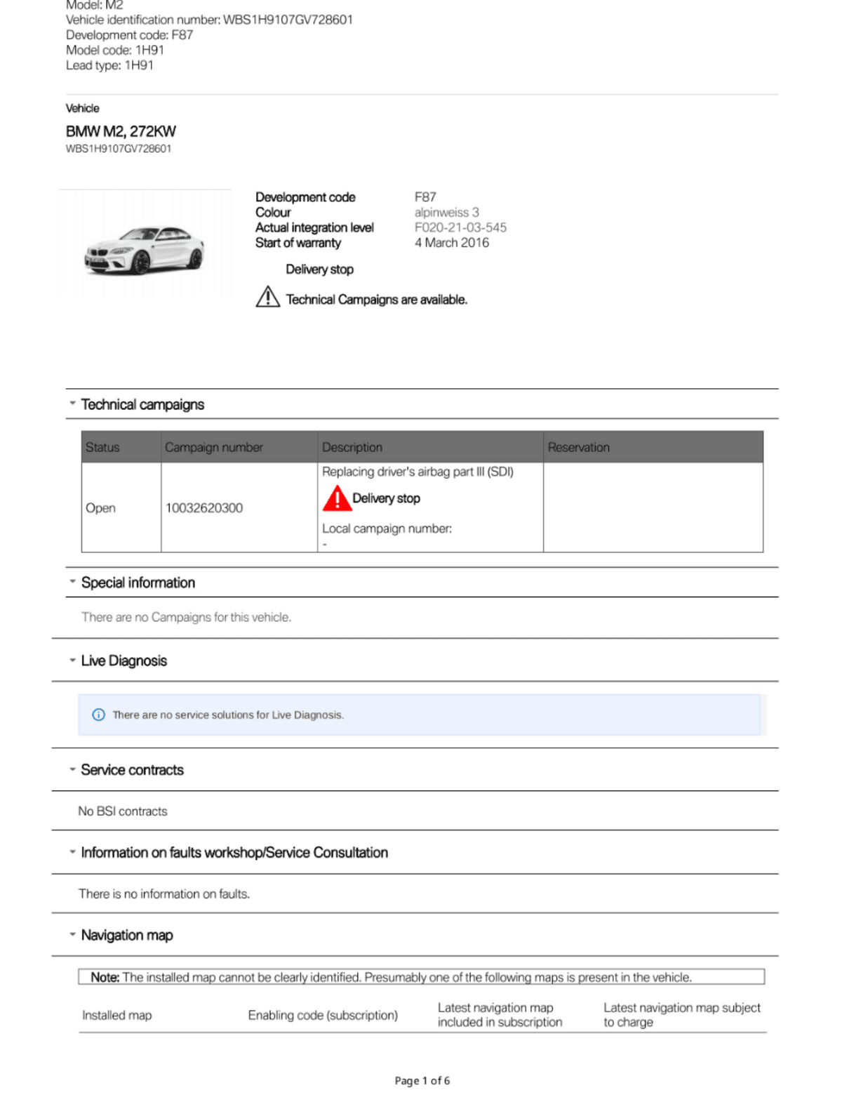BMW Service History Report VIN WBS1H9107GV728601