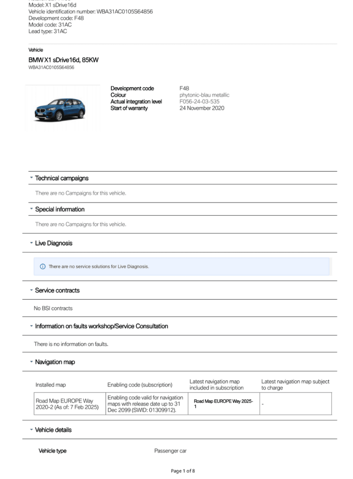 BMW Service History Report VIN WBA31AC0105S64856